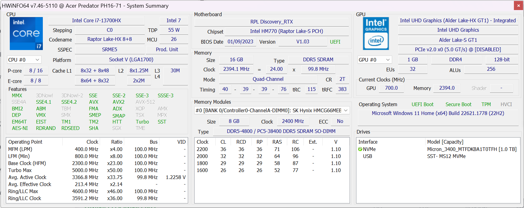 | Acer Predator Helios 16 PH16-71-731Q i7-13700HX, GeForce RTX 4060 Laptop GPU, Micron 3400 1TB MTFDKBA1T0TFH, IPS-LED, 2560x1600, 16" | Acer Nitro 16 AN16-41 R7 7735HS, GeForce RTX 4070 Laptop GPU, Samsung PM9A1 MZVL21T0HCLR, IPS, 2560x1600, 16" | Lenovo Legion Pro 5 16IRX8 i7-13700HX, GeForce RTX 4060 Laptop GPU, SK hynix PC801 HFS512GEJ9X115N, IPS, 2560x1600, 16" | Aorus 15X ASF i7-13700HX, GeForce RTX 4070 Laptop GPU, Gigabyte AG470S1TB-SI B10, IPS, 2560x1440, 15.6" | Asus TUF Gaming A16 FA617 R7 7735HS, Radeon RX 7600S, Micron 2400 MTFDKBA1T0QFM, IPS-Level, 1920x1200, 16" | Dell G15 5530 i7-13650HX, GeForce RTX 4060 Laptop GPU, SSTC CL4-3D512-Q11, IPS, 1920x1080, 15.6" | Gemiddeld NVIDIA GeForce RTX 4060 Laptop GPU | Gemiddelde van klas Gaming | |