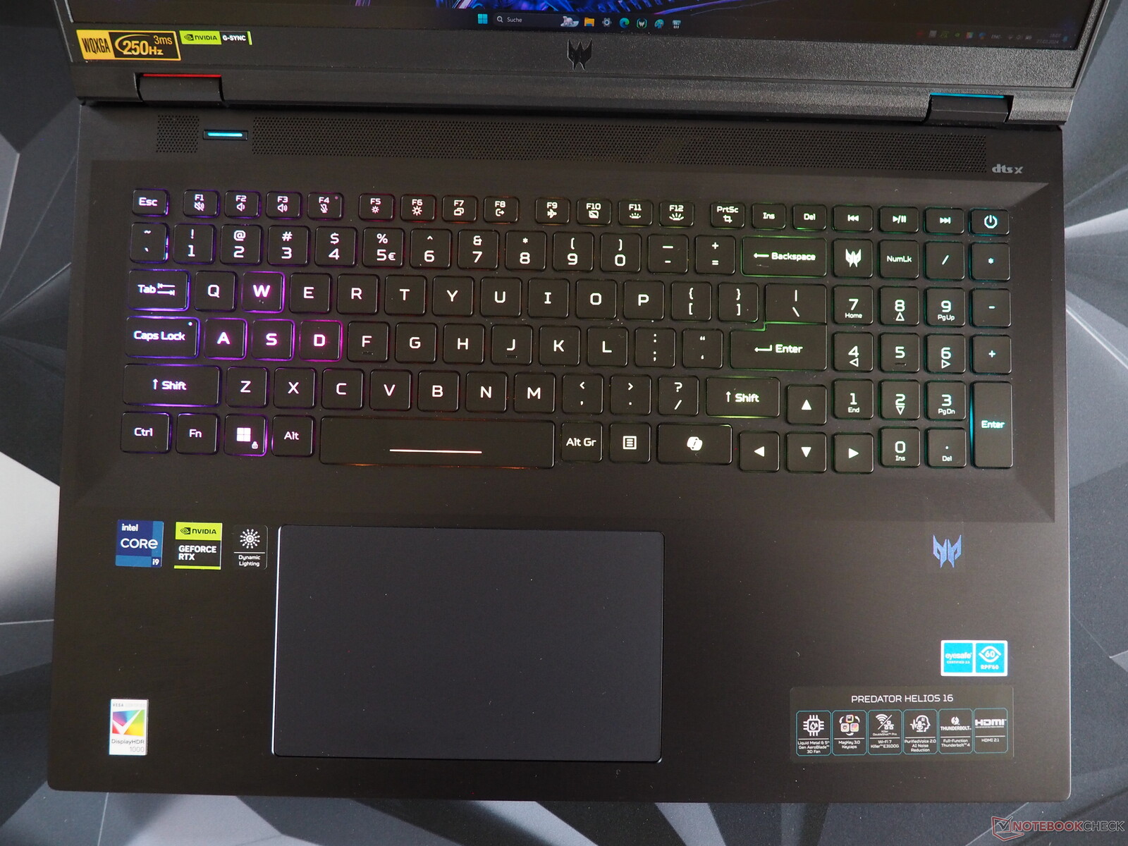 Gamers zullen vooral enthousiast zijn over de uitgebreide verlichting van de laptop (RGB met één toets), die in onze ogen iets gelijkmatiger zou mogen zijn. Voor een klassiek toetsenbord met rubberen omhulsel voelt het verrassend goed aan om op te typen - het is alleen een beetje luid. Afgezien van een paar details (gewijzigd numeriek toetsenblok) is de lay-out goed. In tegenstelling tot andere fabrikanten heeft Acer niet veel geëxperimenteerd en de meeste functies zijn nuttig. De fabrikant verdient ook lof voor de royale toetsgrootte van de laptop (bijv. de pijltjestoetsen van goed formaat).