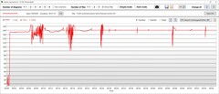De GPU is veel minder consistent en vertoont een prestatiegolfcurve. De kloksnelheid bereikt een cyclisch terugkerend maximum van 2,5 GHz en de curvedalen liggen rond de 1,2 GHz. Tegelijkertijd hebben we zeer spontane dalingen gemeten naar slechts 200 MHz voor fracties van een seconde in de verder constante geheugenklok van 2,3 GHz. De GPU-temperatuur schommelt ook, maar is gemiddeld slechts 64 °C, maximaal 76 °C. Het stroomverbruik schommelt tussen 25 W en 90 tot 100 W.