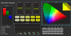 De laptop profiteert van typische OLED-voordelen zoals perfecte zwarttinten en de daaruit voortvloeiende (theoretisch) oneindig:1 contrastverhouding. Ook de kleurnauwkeurigheid is vrij hoog. Het paneel dekt de kleurruimtes P3, sRGB en AdobeRGB 1998 bijna volledig. Dit zou de laptop een ideale keuze maken voor professionele mediamakers. Onze metingen wijzen echter op een verhoogde kleurafwijking af-fabriek (deltaE=3.5), die aanzienlijk kan worden verbeterd door een kalibratie (deltaE=2.1). Ons post-kalibratie kleurprofiel kan worden gedownload hier.