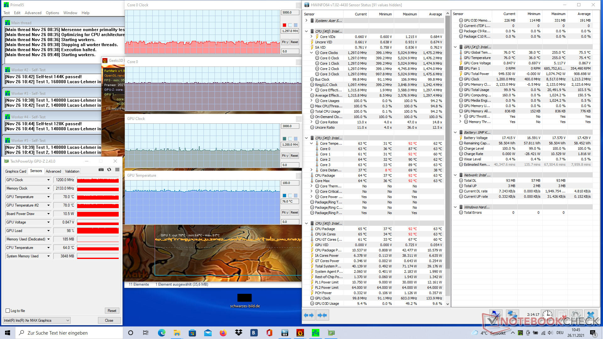De GPU en CPU worden tijdens de stresstest minstens een uur lang belast. Na de gebruikelijke initiële piek stabiliseert de CPU op een constante snelheid van ongeveer 1.500 MHz, wat ruim onder de basiskloksnelheid is, en bij een goede 60 °C (~140 °F). De speciale GPU draait constant op ongeveer 1.200 MHz en net onder 80 °C (~176 °F)