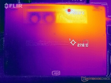 De oppervlaktetemperaturen zijn niet significant koeler of warmer dan wat we registreerden op de Ryzen 7 7735U configuratie. Hete plekken aan de onderkant bereiken nog steeds meer dan 50 C in de buurt van de ventilatieopeningen, terwijl het bovenste oppervlak in de buurt van de scharnieren kan variëren van 40 C tot 50 C, afhankelijk van de hoek van het deksel. Het is onwaarschijnlijk dat handen deze hete gebieden langdurig aanraken tijdens het gamen.