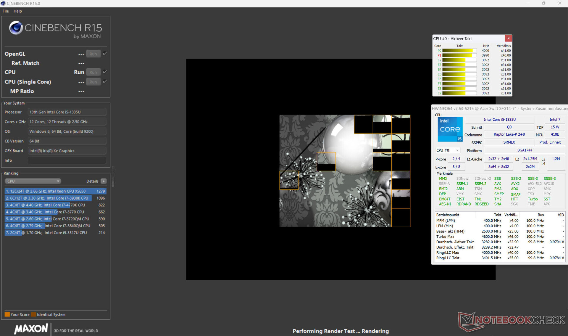 De stresstest (Prime95 en Furmark bij continu gebruik) simuleert een extreem scenario om te analyseren hoe stabiel het systeem blijft onder volledige belasting. Na het begin van de test zakte de kloksnelheid van de CPU aanzienlijk (P: 1,6 tot 1,8 GHz, E: 1,4 tot 1,5 GHz). De grafische kaart draaide met waarden rond de 1.000 MHz.