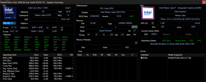 | Acer Swift Go 14 SFG14-72 Arc 8-Core, Ultra 7 155H, SK hynix HFS001TEJ9X110NA | Acer Swift Go 14 SFG14-71 Iris Xe G7 80EUs, i5-1335U, WD PC SN740 SDDQNQD-512G-1014 | LG Gram 2in1 16 16T90R - G.AA78G Iris Xe G7 96EUs, i7-1360P, Samsung PM9A1 MZVL21T0HCLR | HP Pavilion Plus 14-ew0153TU Iris Xe G7 96EUs, i7-1355U, SK hynix PC801 HFS001TEJ9X101N | Lenovo ThinkPad T14 G4 21K4S02000 Radeon 780M, R7 PRO 7840U, Samsung PM9A1a MZVL21T0HDLU | Ayaneo Air 1S Retro Power Radeon 780M, R7 7840U, Ayaneo CyberThunder-2TB | HP Pavilion Plus 14-ey0095cl Radeon 780M, R7 7840U, WDC PC SN810 1TB | |