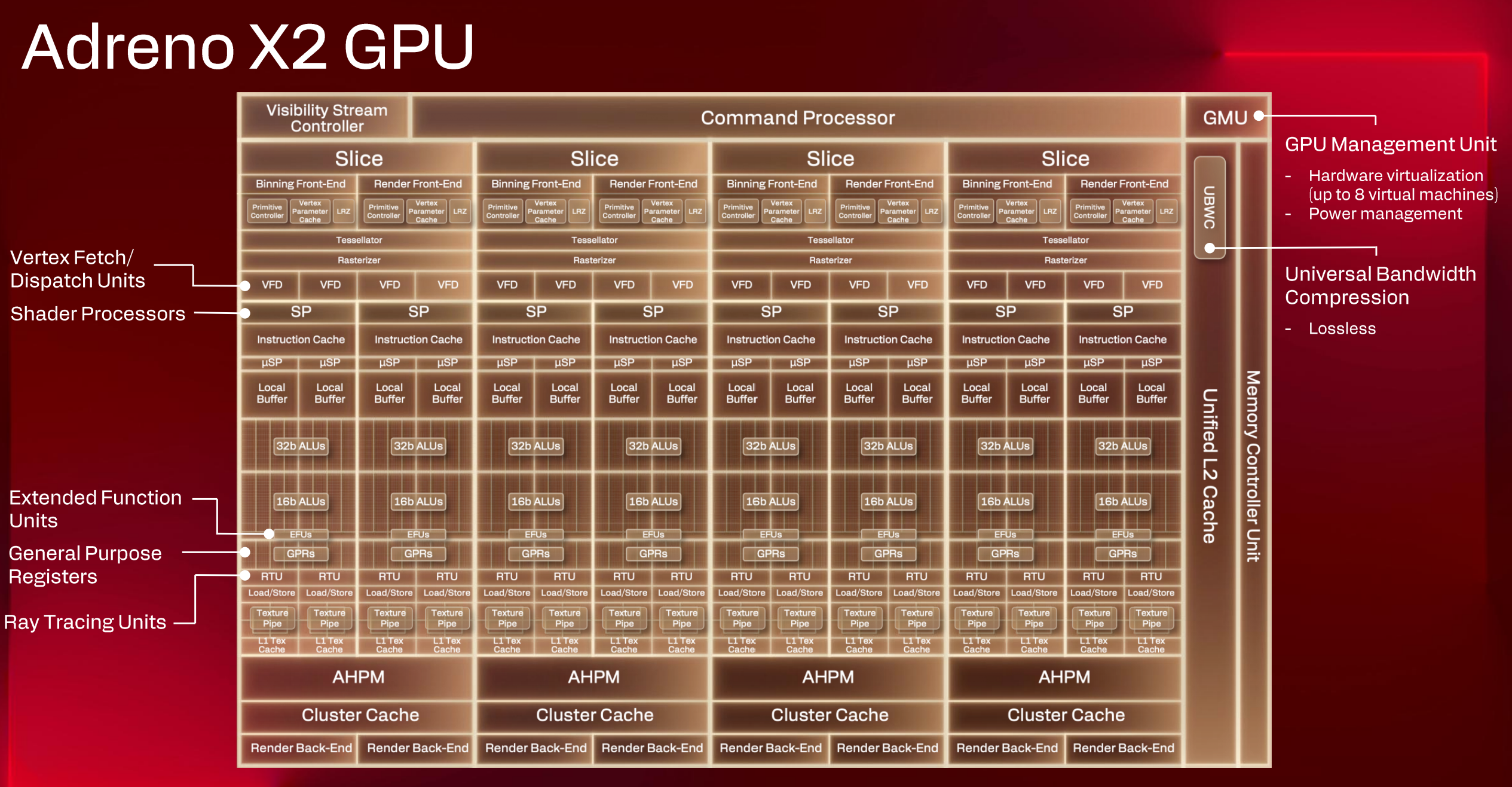 De Adreno X2 bereikt dit met 21 MB van wat Qualcomm 'high-performance on-chip memory' noemt. Dit is in wezen een blok L3-cache dat toegankelijk is voor alle render slices (5,25 MB/slice). Qualcomm beweert dat shader-processors er tot 4 TB/s toegang toe hebben. Verder heeft de GPU toegang tot het LPDDR5X-9523 RAM van de SoC met een snelheid tot 228 GB/s. Elke slice van de Adreno X2 heeft twee texture pipelines, vier raytracing-eenheden, twee render backends en twee shaderprocessors.