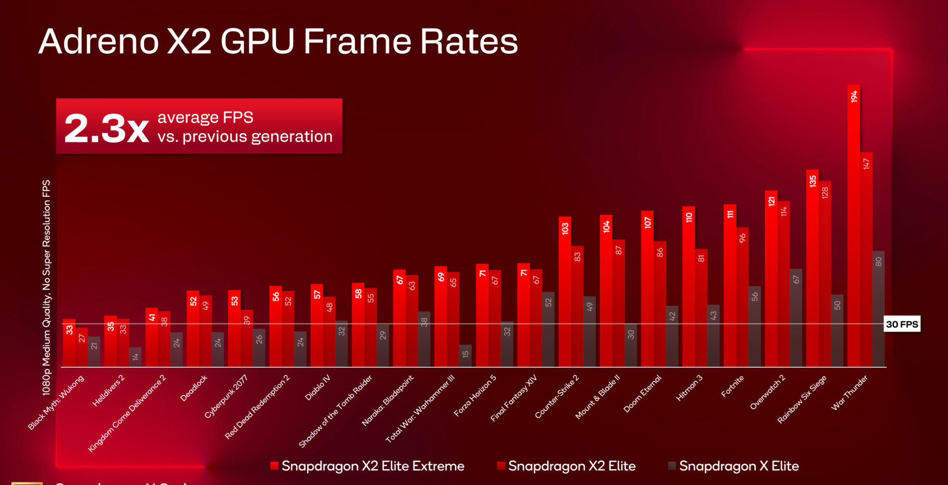 Qualcomm heeft ook een aantal first-party benchmarks van de Adreno X2 gepubliceerd. Hoewel de Adreno X2 het moeilijk heeft in sommige grafisch veeleisende titels zoals Black Myth: Wukong, blinkt hij uit in lichtere titels zoals War Thunder, waar de GPU zijn voorganger met een opmerkelijke marge overtreft. De grafieken bevestigen ook dat de Snapdragon X2 Elite Extreme X2E-96-100 een merkbaar krachtigere GPU heeft dan de Snapdragon X2 Elite Extreme X2E-86-100 en X2E-80-100. Hij kan zelfs Cyberpunk 2077 afspelen met bijna 60 FPS, een behoorlijk opmerkelijke verbetering ten opzichte van de vorige generatie.