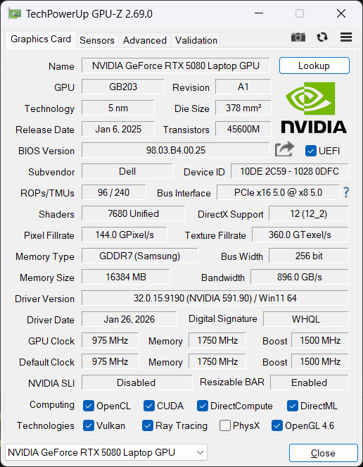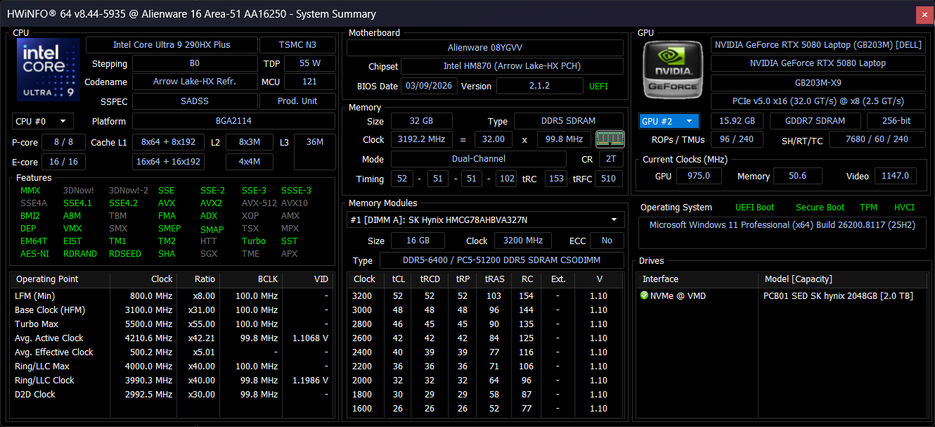 | Alienware 16 Area-51 Intel Core Ultra 9 275HX ⎘ NVIDIA GeForce RTX 5080 Laptop ⎘ 32 GB Geheugen, 1024 GB SSD | Catalogusprijs: 3500 USD | 3.3 kg | 28.5 mm | 16.00" 2560x1600 189 PPI IPS | |