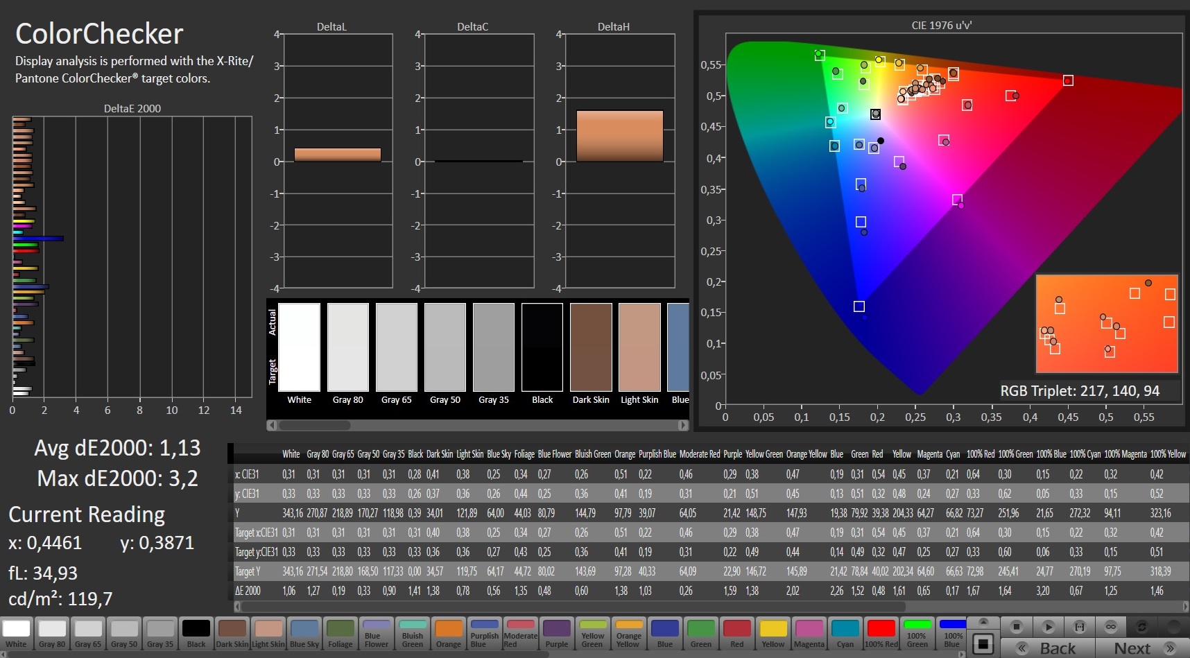 | Colorchecker dE 2000 calibrated * | 1.13 | 1.51 -34% | 0.68 40% | 1.26 -12% |
