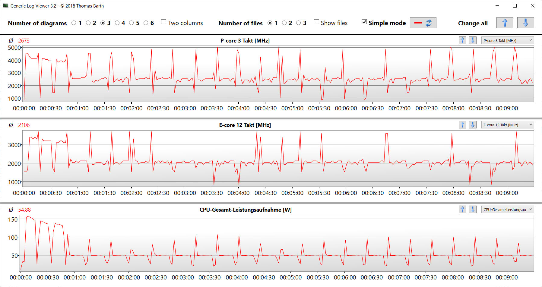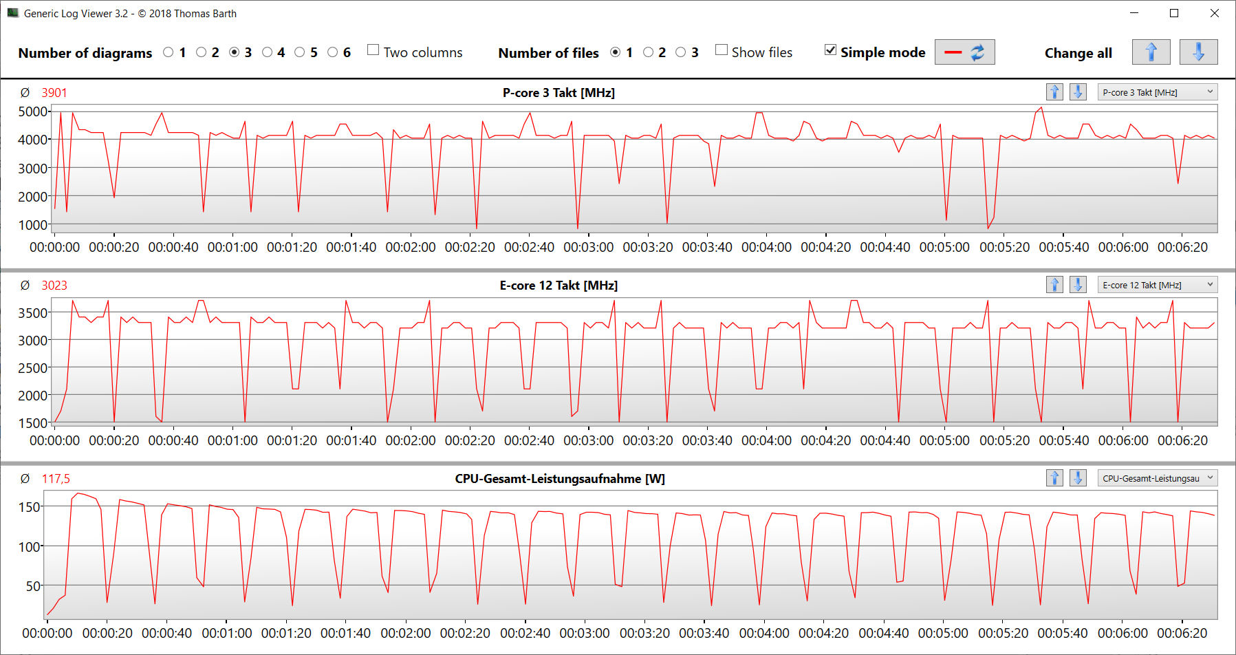 De stresstest (Prime95 en Furmark in continu bedrijf) vertegenwoordigt een extreem scenario om de stabiliteit van het systeem onder volledige belasting te controleren. De CPU (P: 4.2 GHz, E: 3.4 GHz) begint de test met een hoge kloksnelheid. Naarmate de test vordert, daalt de klok iets totdat deze na ongeveer 30 minuten plotseling daalt tot waarden onder de basisklok. De GPU werkt constant op vol vermogen.
