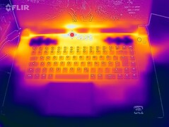 De palmsteunen blijven ook koel onder belasting. Er ontstaan echter hete plekken tot 56 °C, vooral aan de onderkant in het midden richting het beeldscherm. Er zijn concurrenten die het iets koeler houden, maar ook de Alienware blijft niet achter; minstens één apparaat (Aorus 17) bereikt vergelijkbare temperaturen.