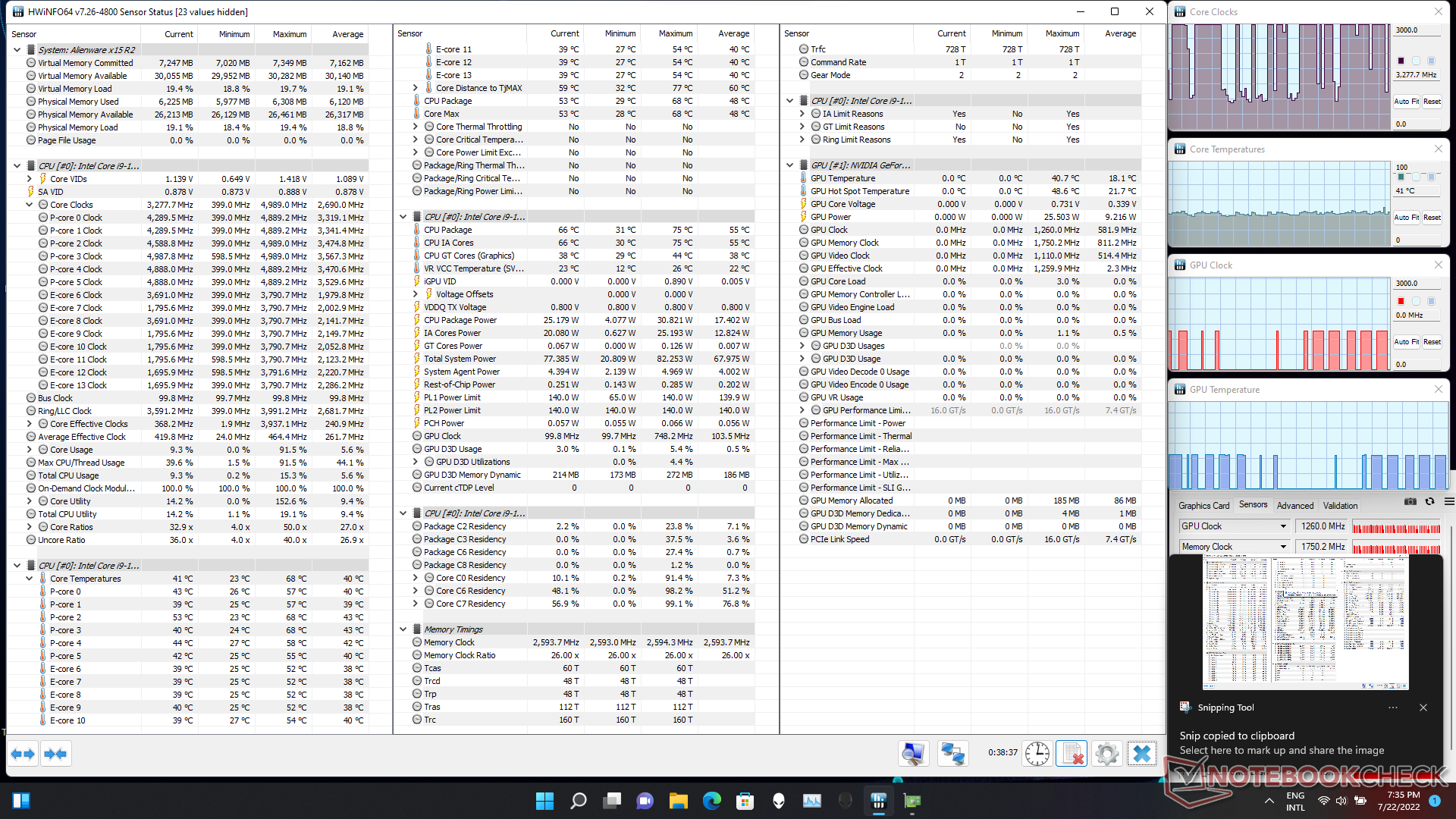Stress tests van de Alienware x15 R2 vertellen ons hoe verschillende CPU en GPU parameters variëren onder verschillende belastingen