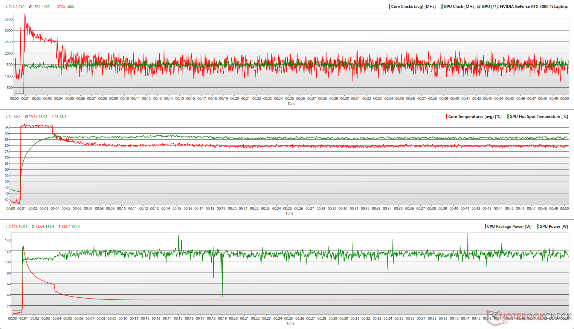Het belasten met De Witcher 3 presenteert een meer realistisch scenario, en we vinden CPU-klokken die pieken op 4 GHz en zich al snel vestigen rond de 2,5 GHz, terwijl de RTX 3080 Ti daalt van een aanvankelijke hoogte van 1.702 MHz en zich stabiliseert rond de 1.500 MHz. De RTX 3080 Ti verbruikt aanvankelijk bijna 130 W, maar daalt al snel naar 120 W. De Core i9-12900H daalt tijdens de run van ongeveer 75 W naar 20 W.