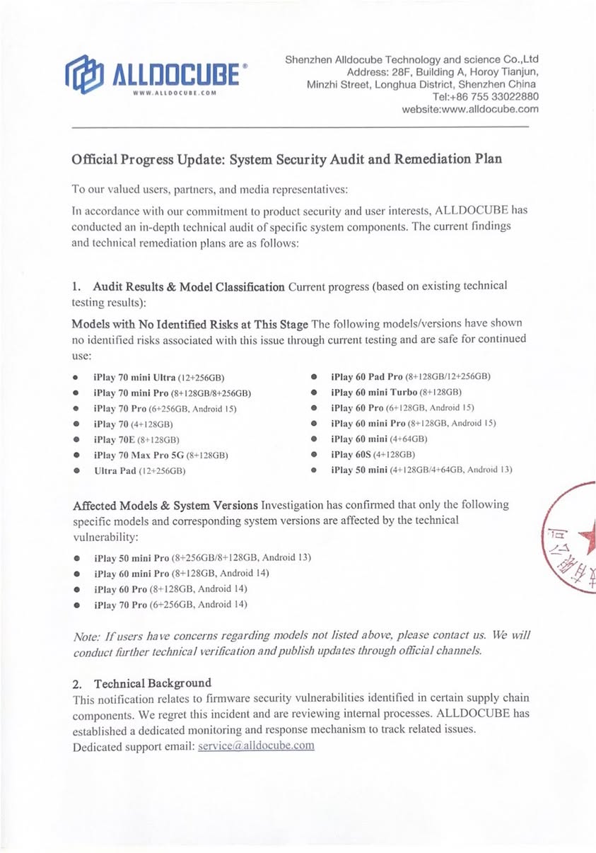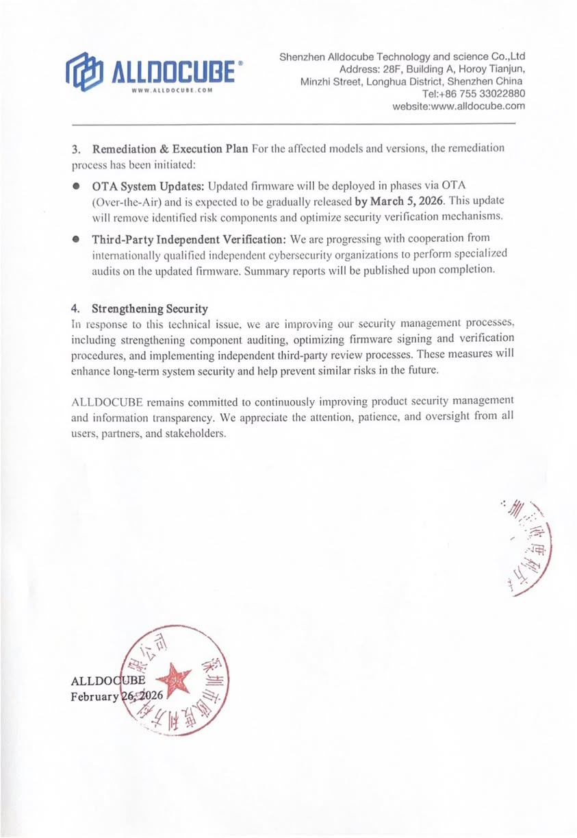 Apparaten die volgens het onderzoek van Alldocube geen direct gevaar lopen, zijn te vinden in de bovenstaande documenten. Alldocube heeft voor 5 maart 2026 OTA firmware-updates beloofd voor de getroffen apparaten, en zal ook audits door derden organiseren om de beveiligings- en veiligheidsnormen van de bijgewerkte firmwares te garanderen.