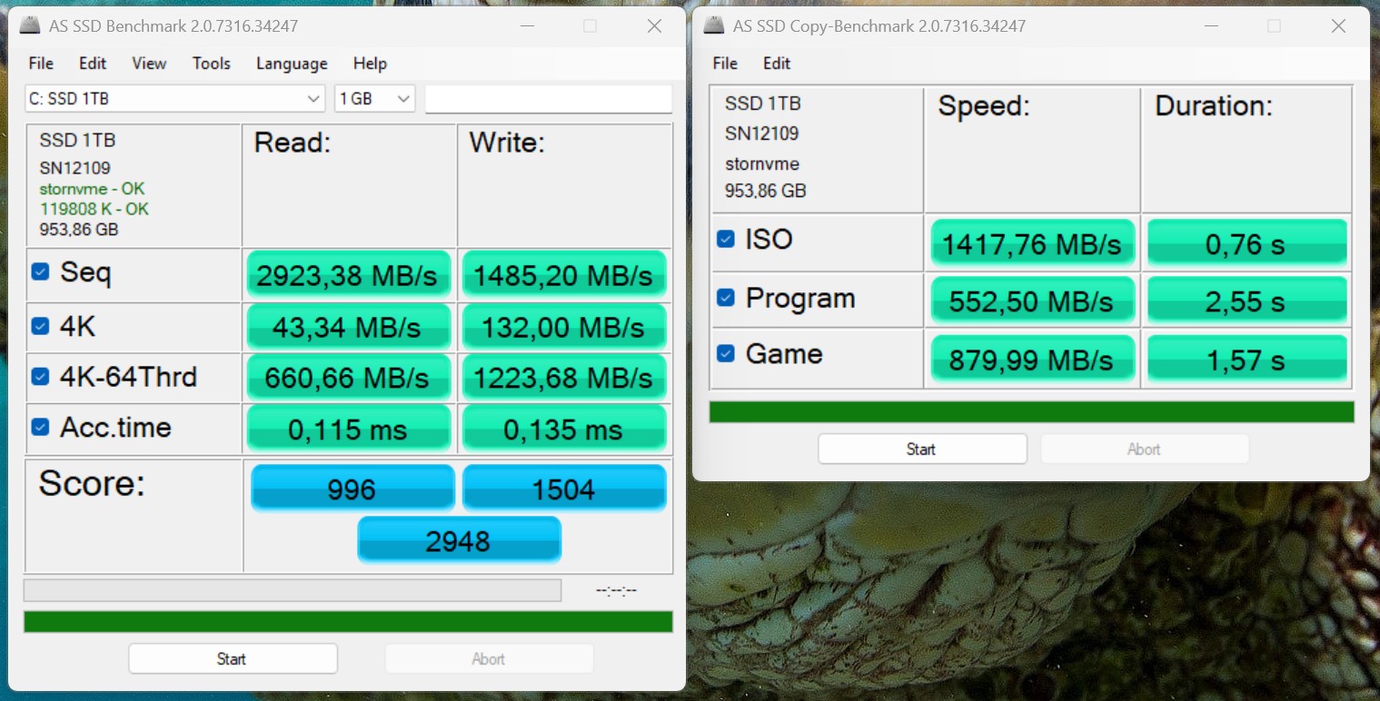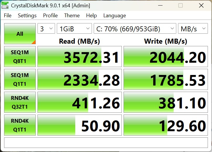 De Alliwava GH8 wordt geleverd met een 1 TB SSD, waarvan de fabrikant niet gespecificeerd is. Dankzij de aansluiting via PCIe 3.0 x4 is het niet een van de snelste modellen en zit het qua prestaties aan de onderkant van het vergelijkingsveld. De prestaties zijn echter voldoende voor alledaagse taken en de SSD werkt ook stabiel onder continue belasting.