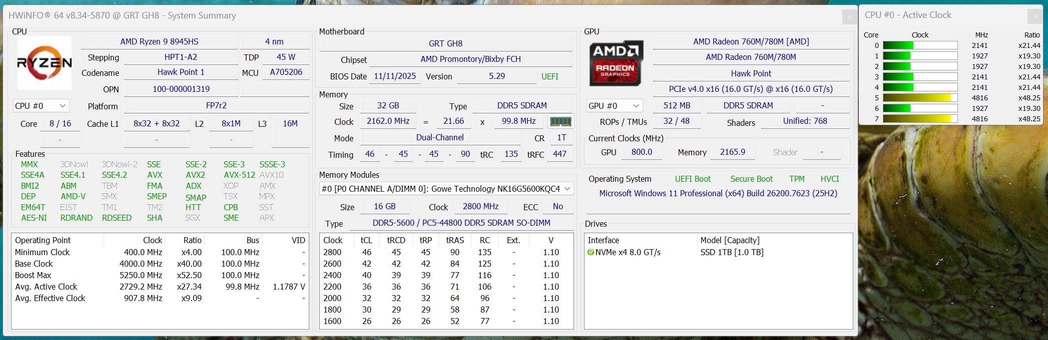 Met de Alliwava GH8 breidt de fabrikant zijn portfolio uit met een krachtige mini-PC die ondanks zijn compacte afmetingen vertrouwt op moderne high-end hardware. Binnenin is de AMD Ryzen 9 8945HS gebaseerd op de Zen 4-architectuur, die 8 kernen en 16 threads heeft en gericht is op gebruikers. In de hier getoonde configuratie heeft het systeem 32 GB RAM en een SSD van 1 TB tot zijn beschikking, wat een solide basis vormt voor een evenwichtige prestatieontwikkeling.