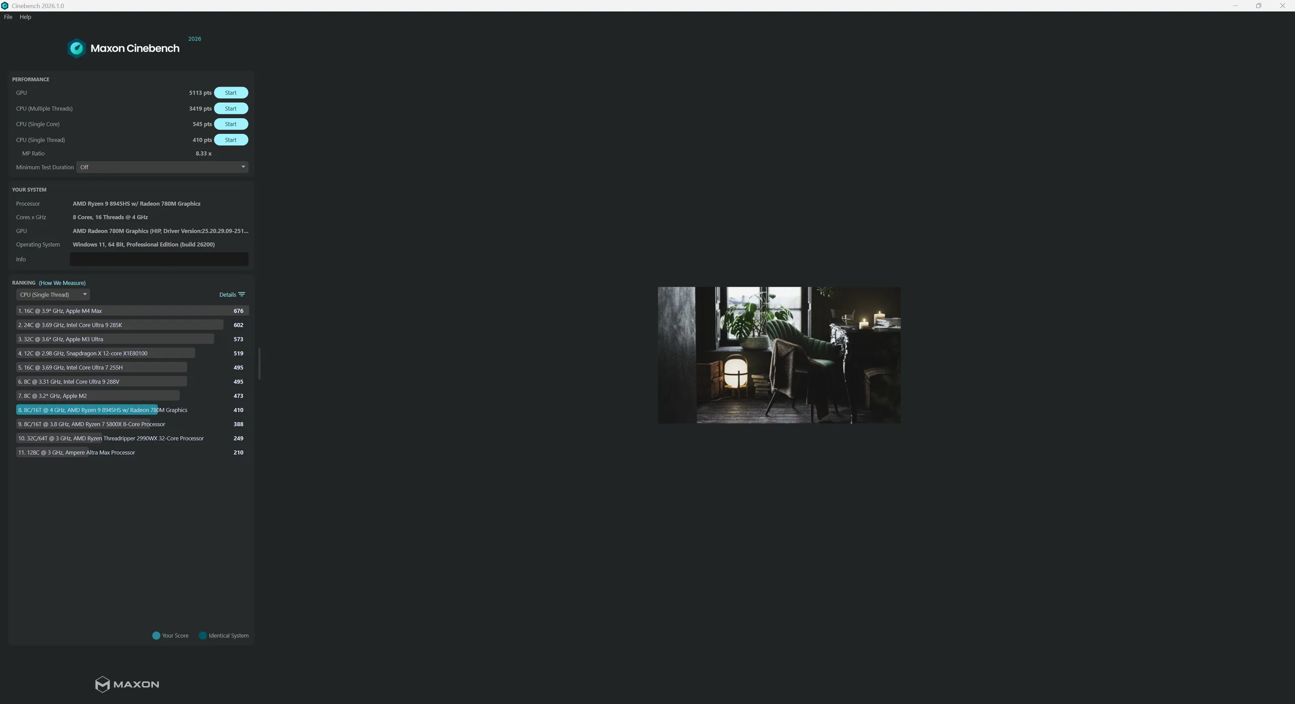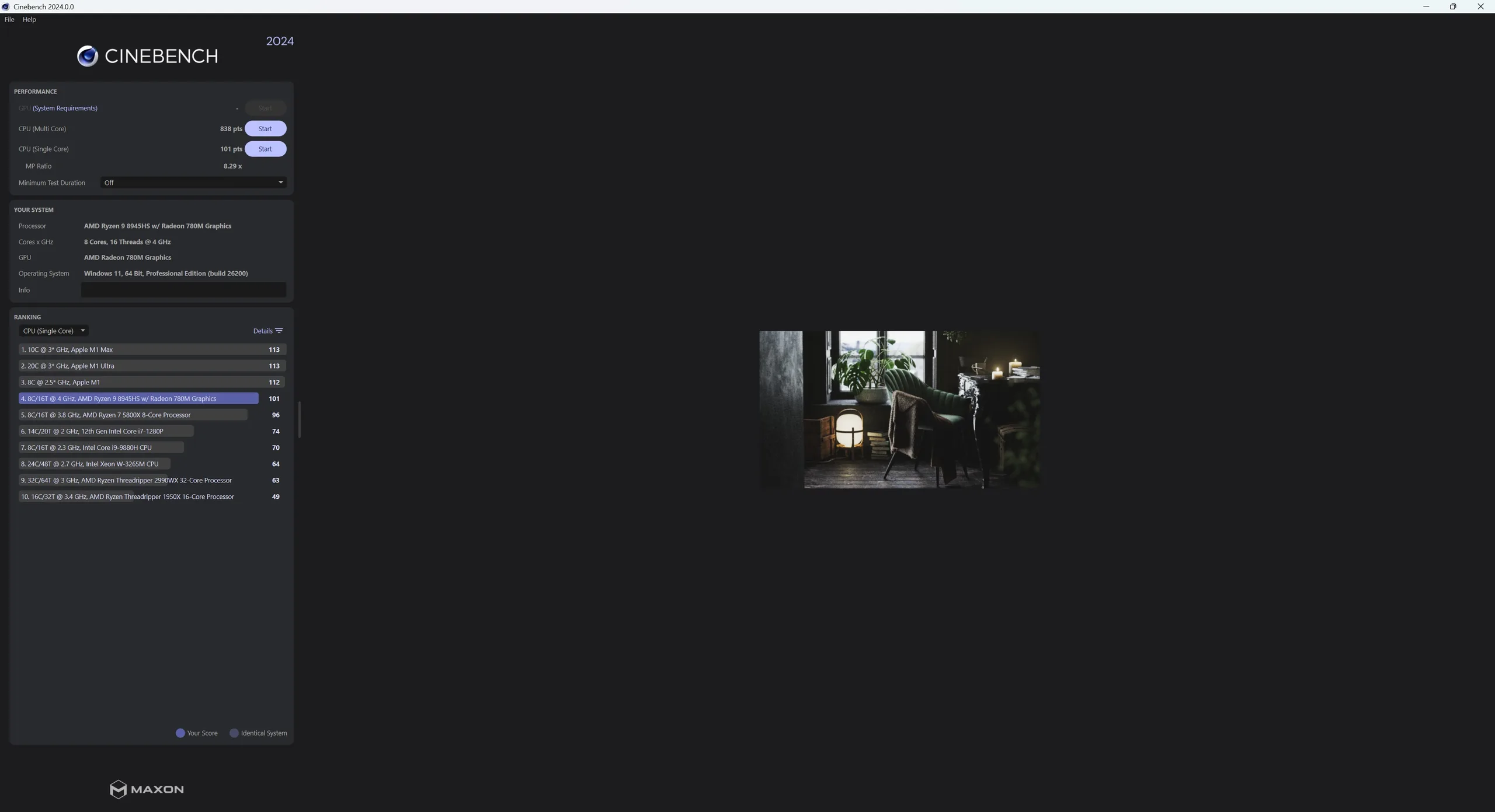 De Alliwava GH8 met AMD Ryzen 9 8945HS (Zen 4, 8 cores en 16 threads) biedt over het geheel genomen veel rekenkracht en is gepositioneerd in het krachtige middensegment van de huidige mini PC's. De SoC kan op korte termijn een stroomverbruik tot ongeveer 65 watt bereiken, maar stabiliseert zich bij langdurige belasting rond de 55 watt. In een directe vergelijking verliest ons testexemplaar het echter van de Geekom A8, die is uitgerust met een vermoedelijk zwakkere AMD Ryzen 7 8745HS.