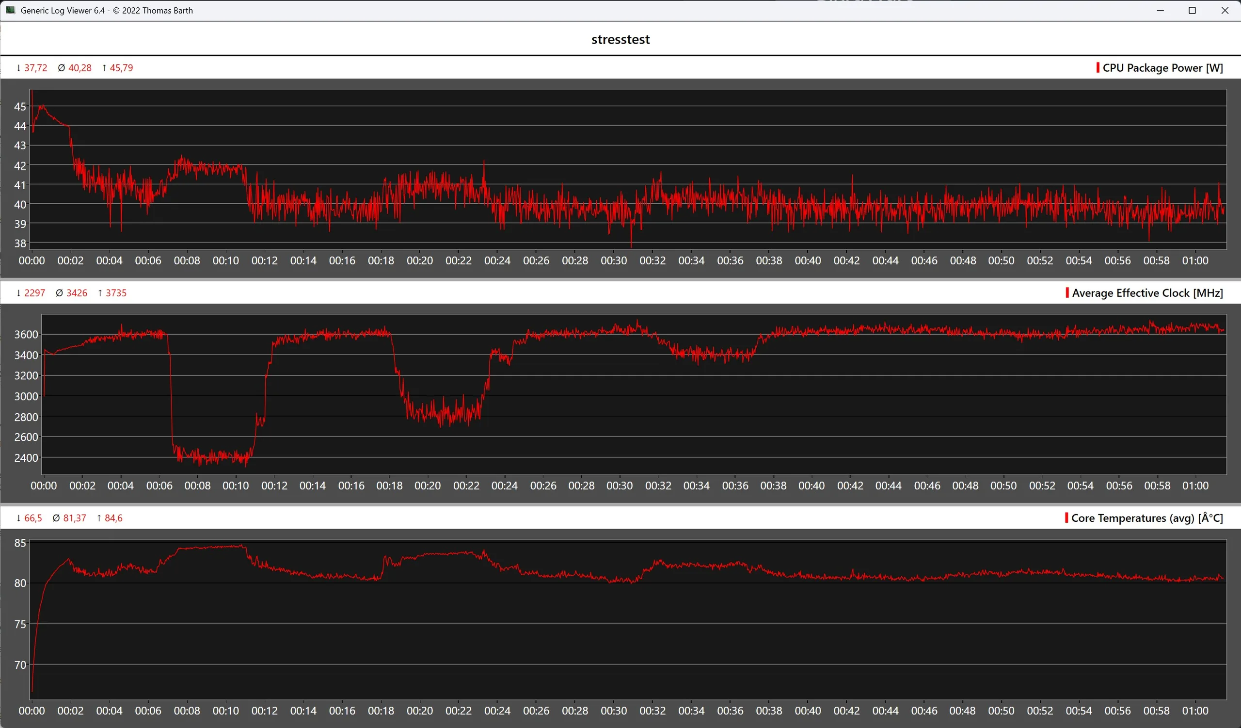 De behuizing van de Alliwava GH8 vertoont geen extreme afwijkingen, noch in ruststand noch onder langdurige belasting. In de stresstest bereikt de geïnstalleerde AMD Ryzen 9 8945HS kortstondig temperaturen van rond de 85 C en bevindt zich daarmee duidelijk in het onkritische bereik. Een permanent toegepaste TDP van 40 watt kan betrouwbaar worden afgevoerd door het koelsysteem, hoewel de temperatuur van de SoC afvlakt rond 81 C.