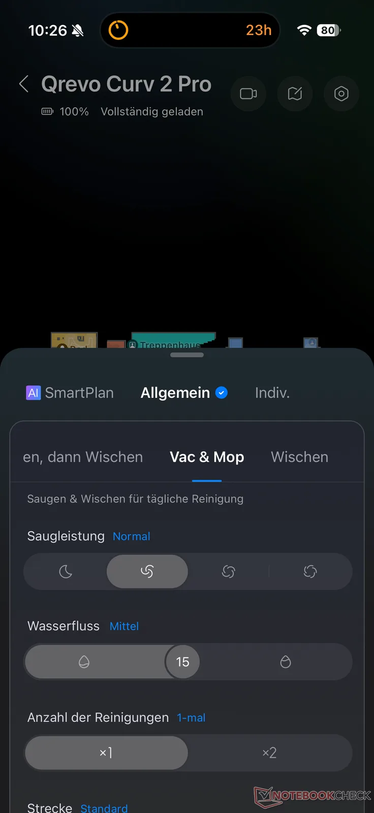 Hetzelfde geldt voor de schoonmaakinstellingen. Afhankelijk van uw keuze kan de robot eerst stofzuigen en dan dweilen, beide tegelijk doen of alleen stofzuigen of dweilen. De zuigkracht kan in vier stappen worden ingesteld en de watertoevoer kan zelfs in 30 uur worden ingesteld. Er zijn ook andere opties zoals het aantal schoonmaakbeurten en de grondigheid van de routekeuze.