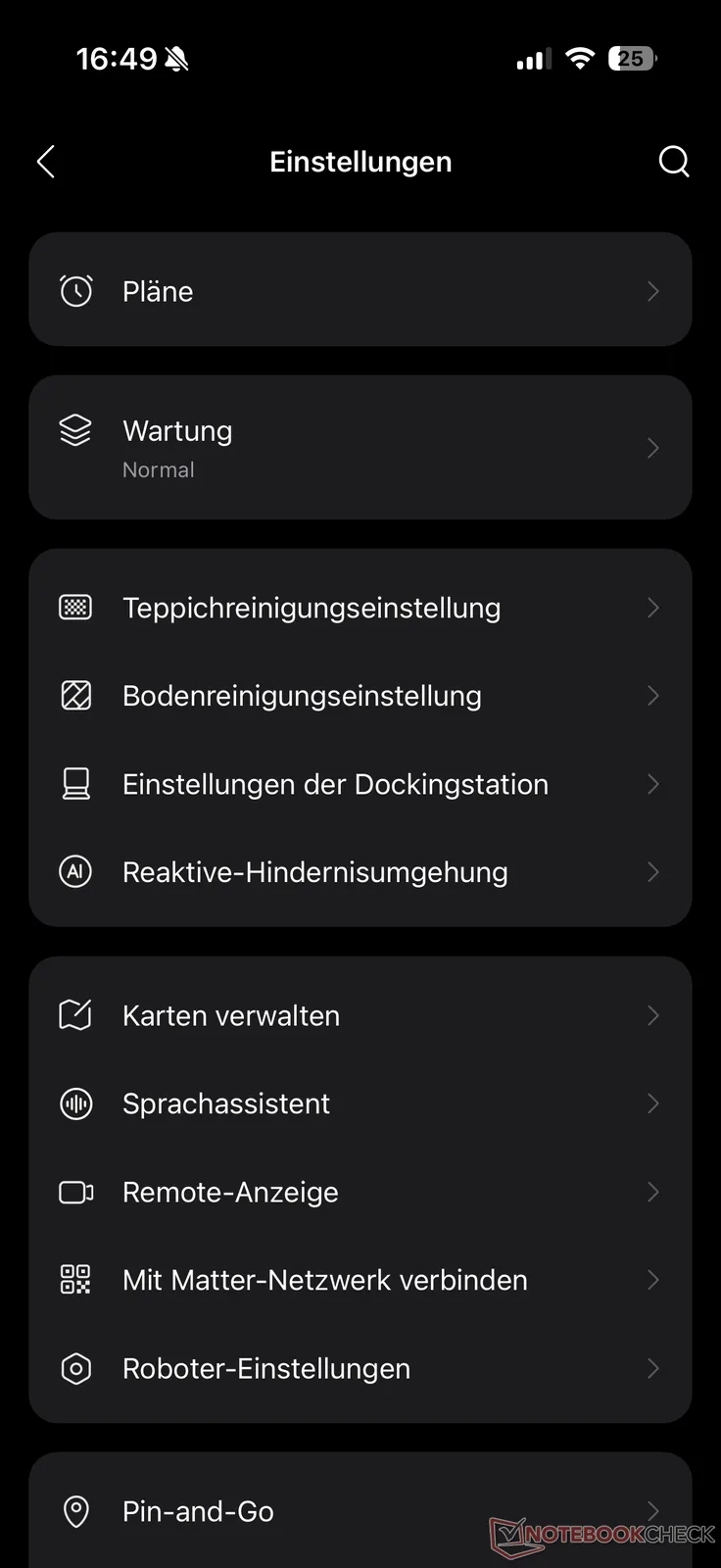 Er zijn nog meer instellingen in het menu. Hier kunnen onder andere het reinigingspatroon, het tapijtgedrag en het automatisch opnieuw dweilen bij vuile plekken worden geactiveerd. Er is ook een overzicht van de schoonmaakgeschiedenis, het aanmaken van automatische schoonmaakschema's, docking station-instellingen en meer.