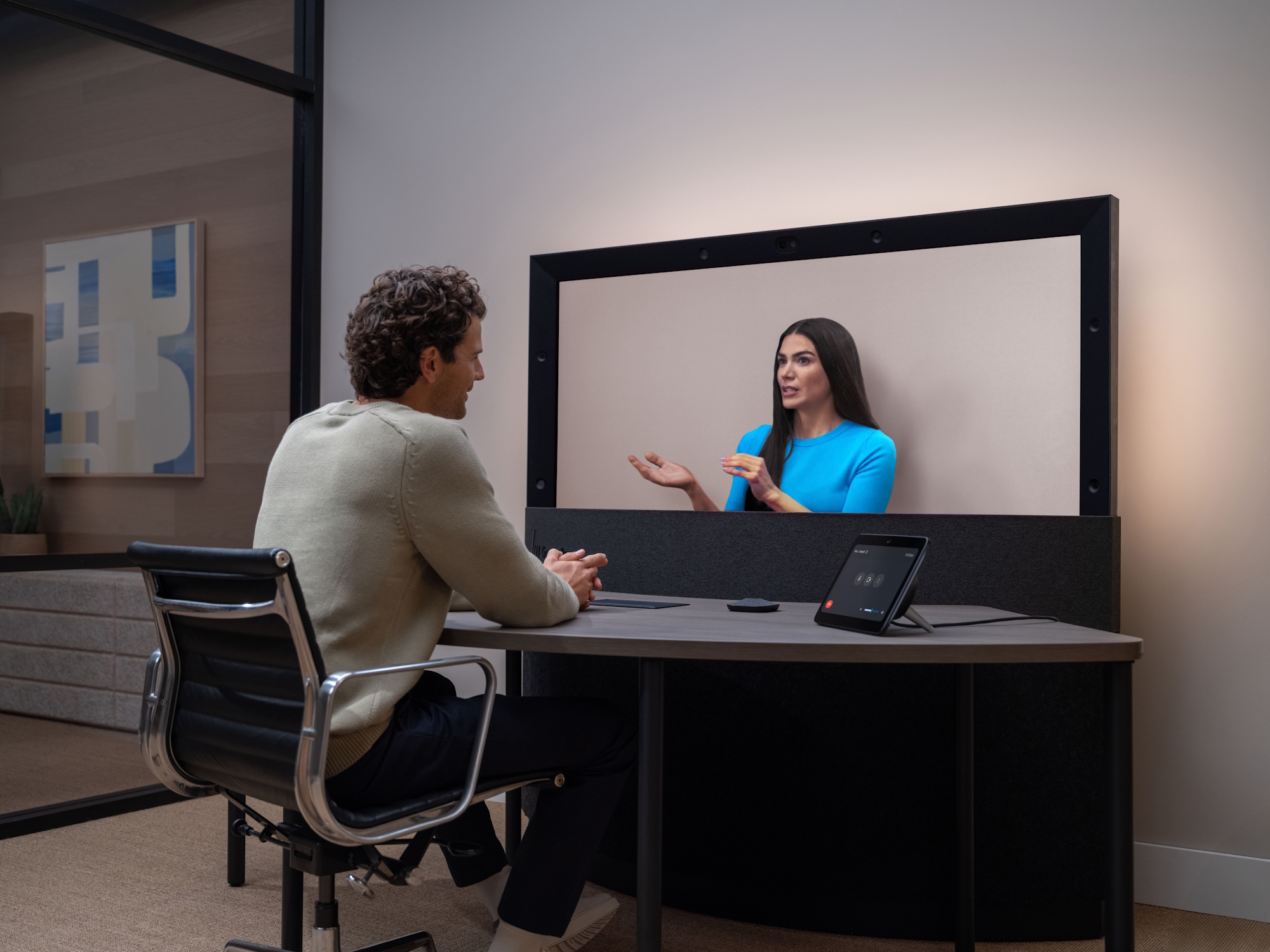 Het is in wezen een enorm 3D-scherm met een reeks camera's eromheen en twee microfoons op een aangesloten tafel. Gebruikers kunnen voor die tafel gaan zitten om videogesprekken te voeren - videogesprekken die echt lijken alsof de persoon met wie u praat recht voor u zit.
