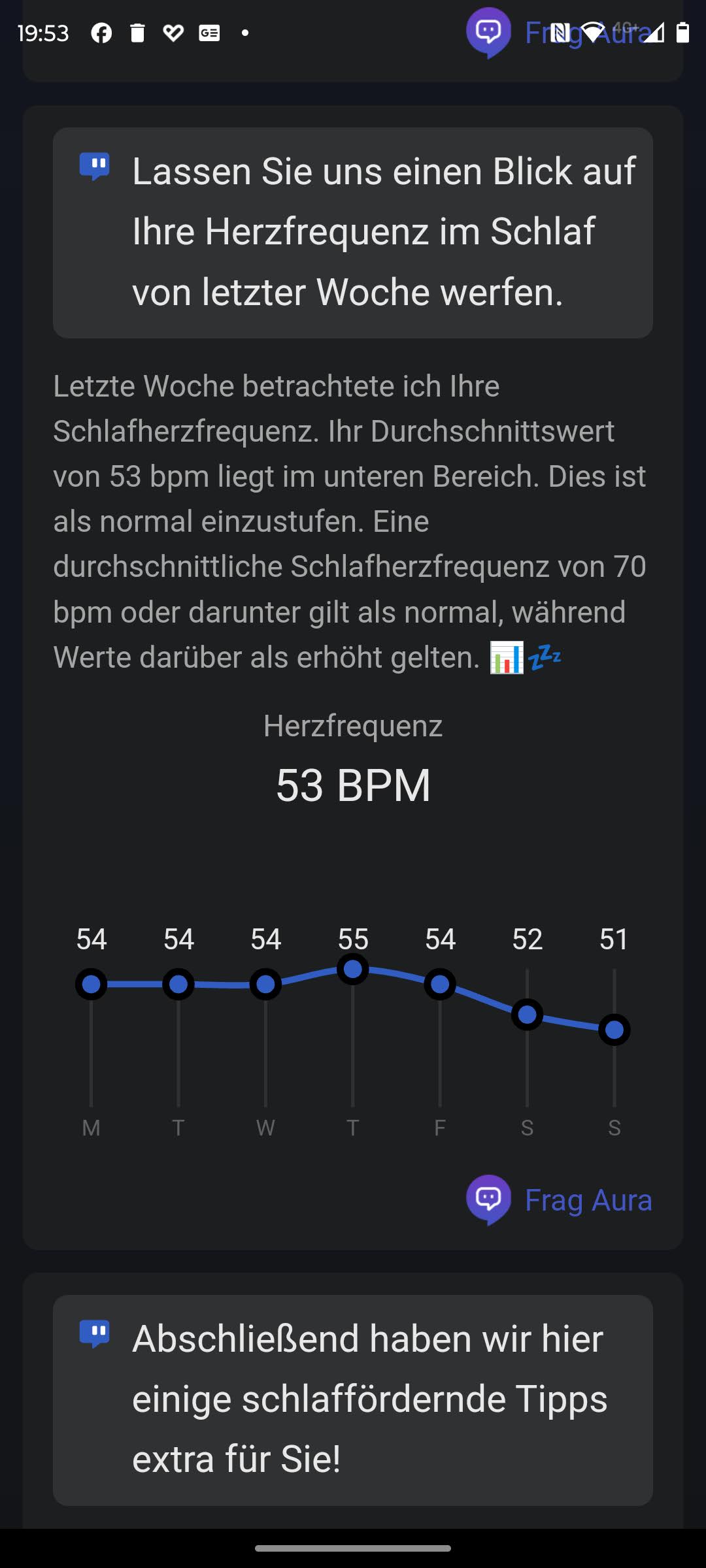 Aura is een AI-ondersteunde assistent die zich voornamelijk richt op slaapgerelateerde functies. Naast het leveren van analyses van wekelijkse statistieken of diepe slaapfases, werkt Aura als een chatbot. Hoewel de schriftelijke antwoorden in het Duits beschikbaar zijn, is de taalversie momenteel beperkt tot het Engels. Aura raadt ontspanningsmuziek aan en ontwerpt een persoonlijk slaapplan. Deze service kost ~US$10 per maand of ~US$75 per jaar, met een gratis proefperiode van zeven dagen. Het is vermeldenswaard dat de virtuele assistent Aura in de cloud wordt opgeslagen, waardoor gegevens ook buiten de smartphone kunnen worden geanalyseerd.