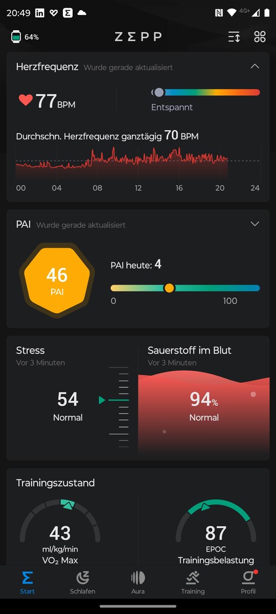 De Zepp-app is in vier secties georganiseerd. Het "Start"-gedeelte biedt een tegeloverzicht voor bereidheid, stappen, slaap, Zepp Aura, hartslag, PAI en trainingsgeschiedenis. Als u op een veld klikt, gaat u naar het betreffende submenu. Twee extra secties zijn gewijd aan slaap en training.