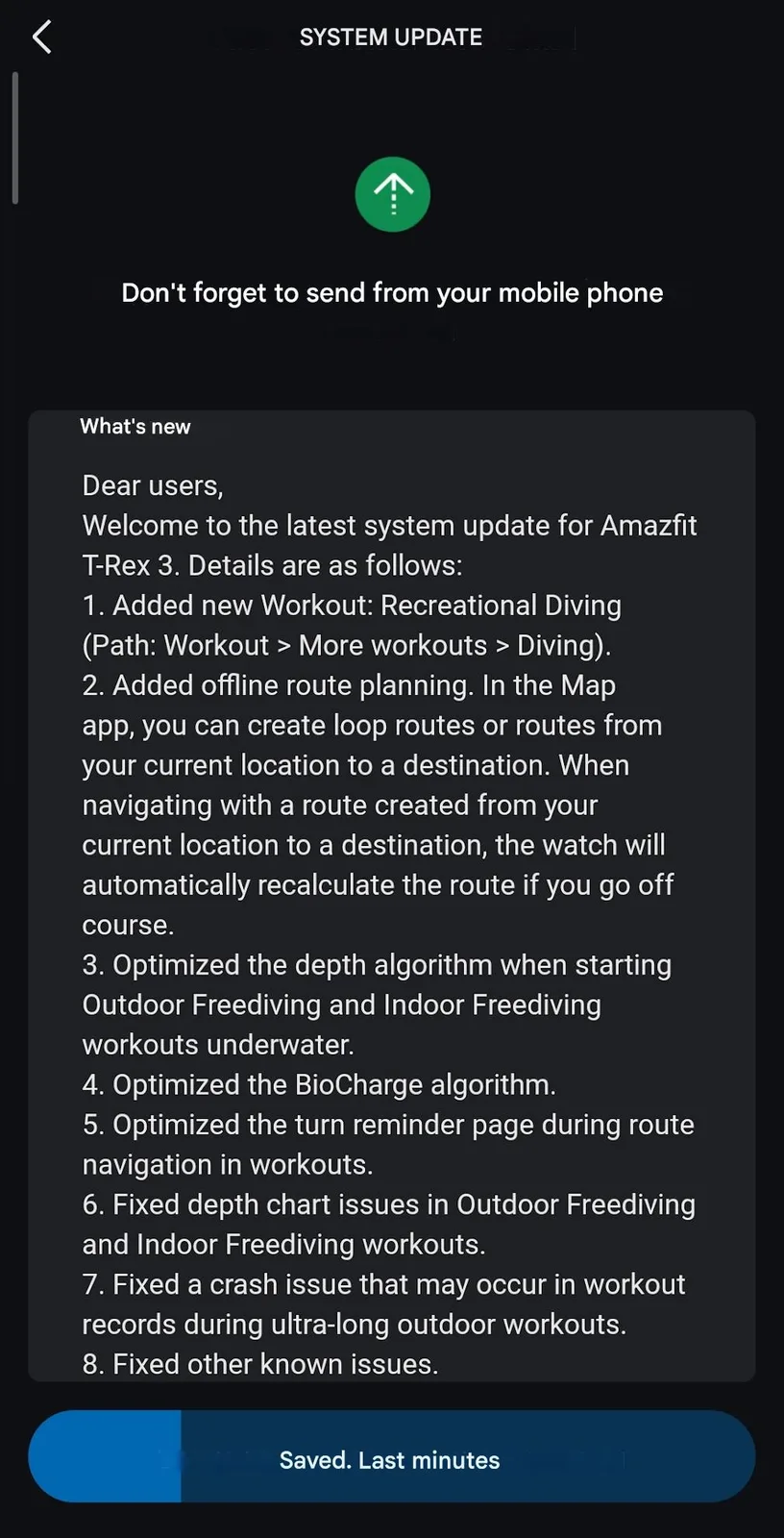 Zepp Health geeft aan dat de Amazfit T-Rex 3 smartwatch softwareversie 4.5.3.3 het dieptealgoritme optimaliseert dat wordt gebruikt voor Outdoor Freediving en Indoor Freediving workouts. Het algoritme achter de BioCharge tool voor het monitoren van het energieniveau zou verbeterd zijn. Er zijn ook wijzigingen aan de pagina met afslagherinneringen, die wordt weergegeven wanneer u tijdens een training routenavigatie gebruikt. Bovendien zijn er bugfixes voor dieptekaarten van Freediving en crashes tijdens ultralange buitentrainingen.