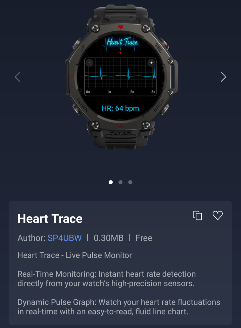 De populairste van de drie Mini Apps is Heart Trace, momenteel op de tweede plaats in de Zepp OS Weekly Top 50 Downloaded Apps Chart. Dit is een live hartslagmeter, waarmee gebruikers hartslaggegevens die door hun smartwatch zijn verzameld in realtime kunnen bekijken. De metingen worden weergegeven op een dynamische hartslaggrafiek, die door de ontwikkelaar wordt omschreven als "een gemakkelijk te lezen, vloeiende lijngrafiek".