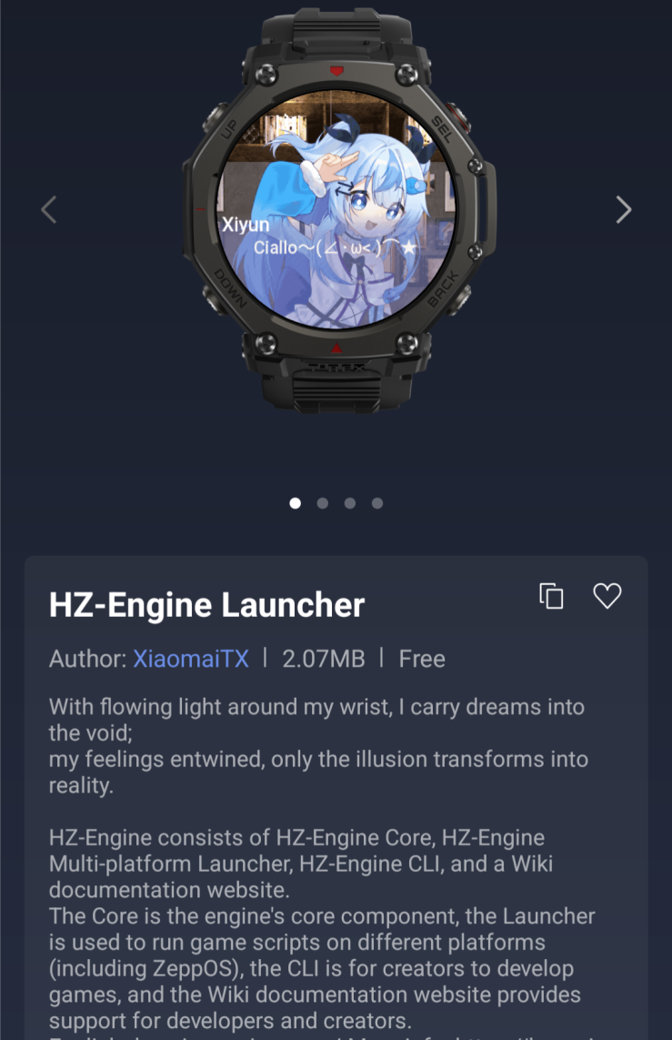 De populairste nieuwe app, volgens de Zepp OS Weekly Top 50 Downloaded Apps chart, is HZ-Engine Launcher. De launcher kan worden gebruikt om spelscripts voor de visual novel engine op Zepp OS uit te voeren. Andere populaire recente toevoegingen zijn de Telegram-client tgwatch en CaferoChat, beschreven als een "minimalistische smartwatch chat-app".