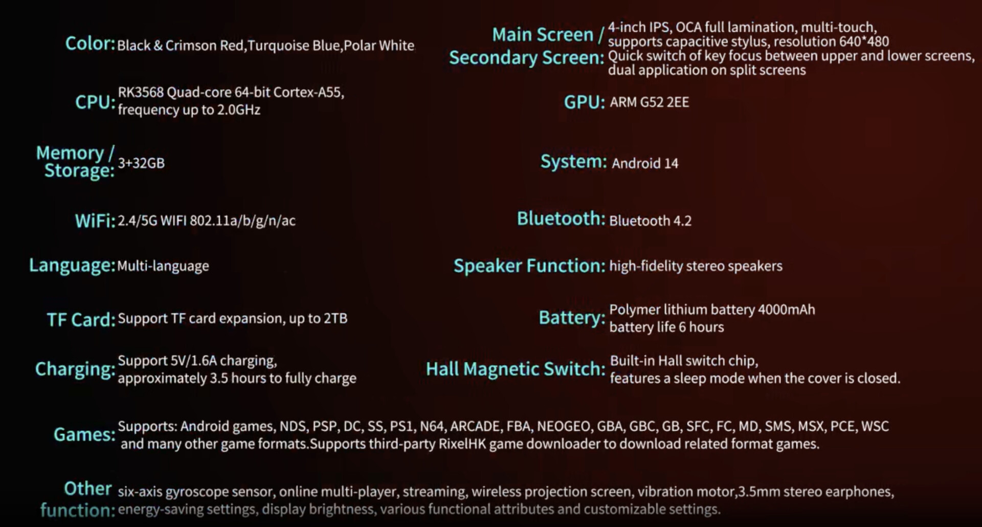 Nu lijkt een schurkachtige AliExpress listing veel van de resterende vragen over de RG DS voortijdig beantwoord. In het kort blijkt de RG DS veel zwakker te zijn dan de video's van Anbernic suggereerden. De listing geeft aan dat Anbernic de RG DS heeft uitgerust met een Rockchip RK3568 chipset, 3 GB RAM, 32 GB opslag en een 4.000 mAh batterij. Bovendien zou de handheld een 640 x 480-pixel beeldscherm hebben, mogelijk dat van de RG40XX H.
