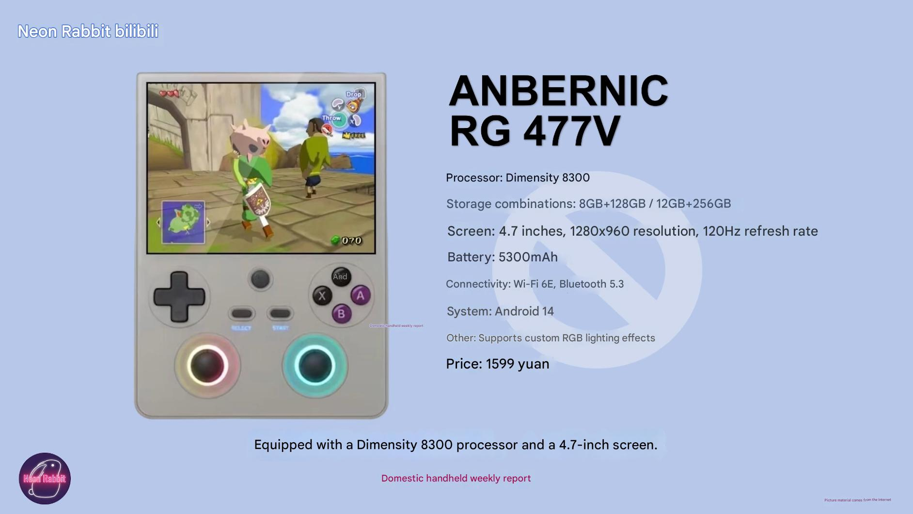 Volgens leaker Neon Rabbit bereidt Anbernic nu een nieuw alternatief voor op de bestaande RG406V. In een bericht op Bilibili beweert het account dat Anbernic de RG477V heeft gemaakt op basis van de ingewanden van de bestaande RG477M. Als zodanig zou de RG477V een MediaTek Dimensity 8300 chipset en een 4,7 inch IPS-scherm. Beide upgrades ten opzichte van de hardware in de RG406Vde RG477V zal zijn aanzienlijk snellere chipset gebruiken met een 960p resolutie en een 120 Hz vernieuwingsfrequentie die gebruikt kan worden voor Black Frame Insertion (BFI) om CRT-effecten te verbeteren.