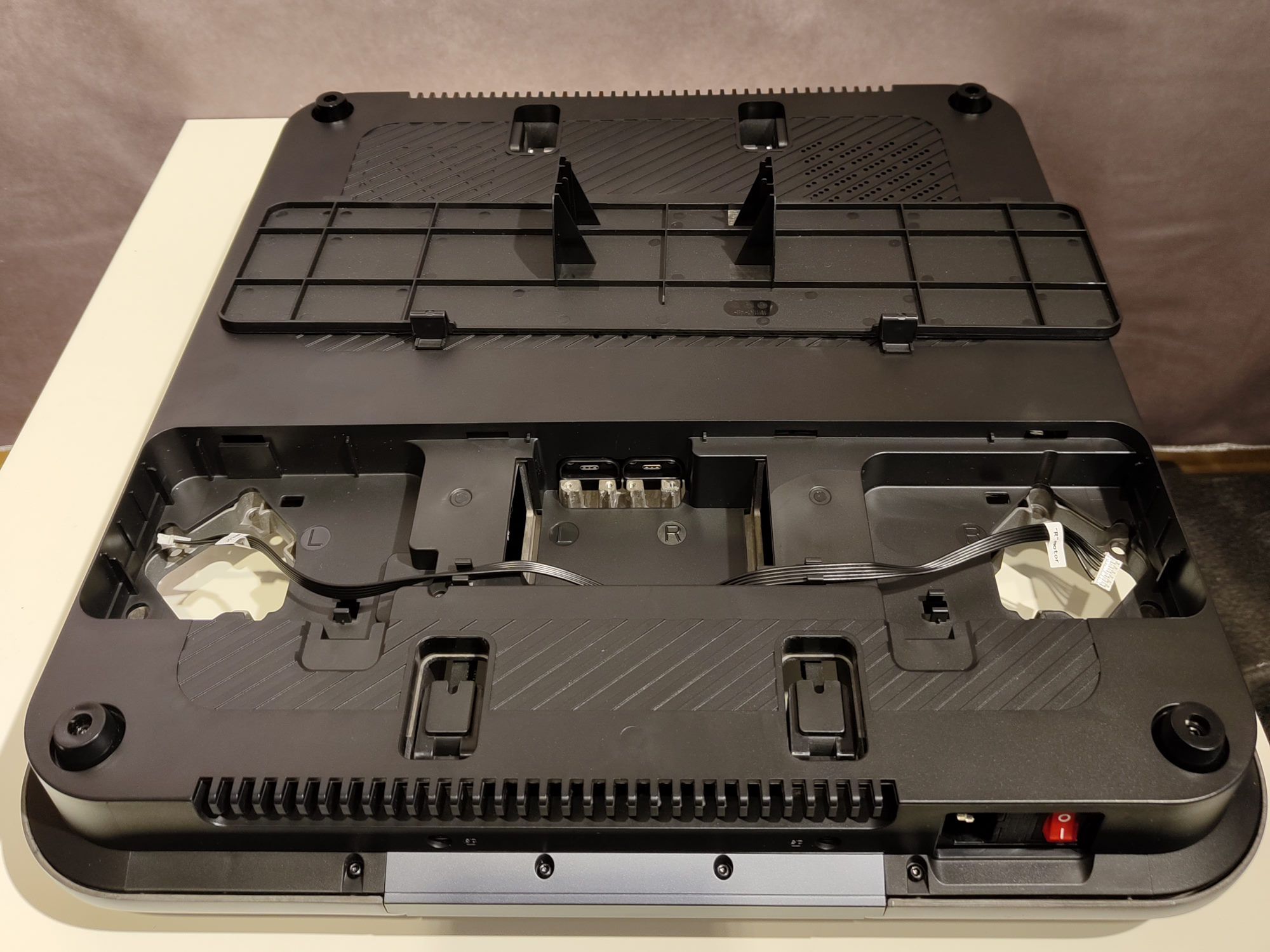 Een blik onder het grote deksel van de basis onthult eersteklas kabelmanagement. Elk onderdeel en elke kabel heeft zijn eigen vaste plek. Onderdelen van het AnkerMake M5 moederbord worden gekoeld via een kleine ventilator.