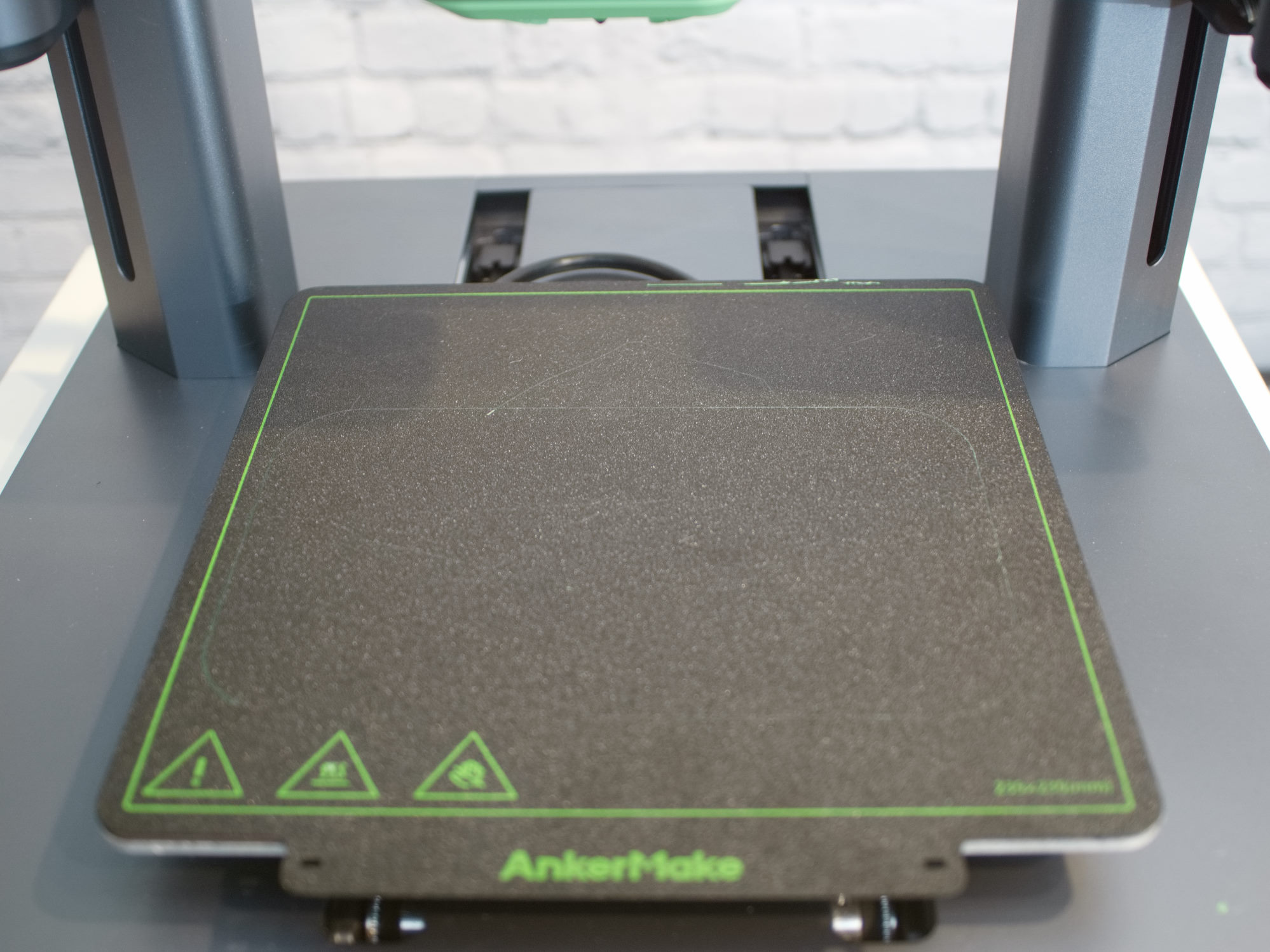De magnetische verenstaalplaat van de AnkerMake M5 heeft aan beide zijden een PEI-coating. Het zwarte oppervlak is uitgesproken ruw en is vergelijkbaar met schuurpapier met een grove korrel. Het printbed wordt verwarmd met maximaal 330 watt, zodat het binnen tweeënhalve minuut kan worden opgewarmd tot een bedrijfstemperatuur van 60 °C. Het printbed is niet geïsoleerd. Het warmtebeeld laat zien dat de temperatuur naar de randen toe merkbaar daalt. Het temperatuurverschil van het midden van het printbed naar de rand bedraagt drie Kelvin bij een temperatuurinstelling van 60 °C.
