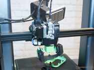 De extrudermotor is rechtstreeks in de printkop geïntegreerd. Een meertraps tandwieloverbrenging zorgt voor een krachtige toevoer. De filamentoverbrenging wordt aan één kant aangedreven. Voor het instellen van de contactdruk van het transportwiel is gereedschap nodig. Net als bij de riemspanner wordt deze ingesteld met een inbusbout. Bij praktijktests heeft de 3D printer bewezen dat hij de beloofde hoge printsnelheden zonder problemen kan aanhouden. Hier print de 3D printer lussen en verhoogt hij de printsnelheid met tussenruimtes van 5 mm. Boven 270 mm/s is onze test echter niet meer overtuigend. In het configuratiebestand waren de maximale filament feed en de maximale bewegingssnelheid zo beperkt dat de printer de hogere vereiste waarden niet meer kon aanhouden. Het lijkt erop dat deze waarden niet overschreden kunnen worden.