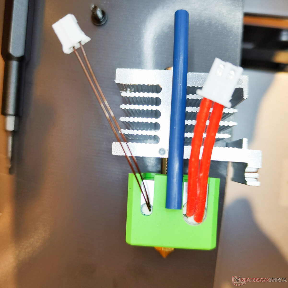De AnkerMake M5 hotend maakt nauwelijks gebruik van standaard onderdelen. Met één centimeter ligt de schroefdraad van het mondstuk tussen de MK8 en het vulkaanmondstuk in. Ook het verwarmingsblok heeft geen standaard afmetingen. Het verwarmingselement en de thermistor voldoen tenminste aan de normen voor 3D-printers. Met een verwarmingscapaciteit van 60 W is het verwarmingspatroon voldoende gedimensioneerd voor het soort hoge snelheden dat de AnkerMake M5 zou moeten kunnen bereiken. De koelventilator duwt lucht naar de achterkant van de printkop. Daarom genereert de printer bij het printen van ASA of ABS geen tocht langs de printplaat.