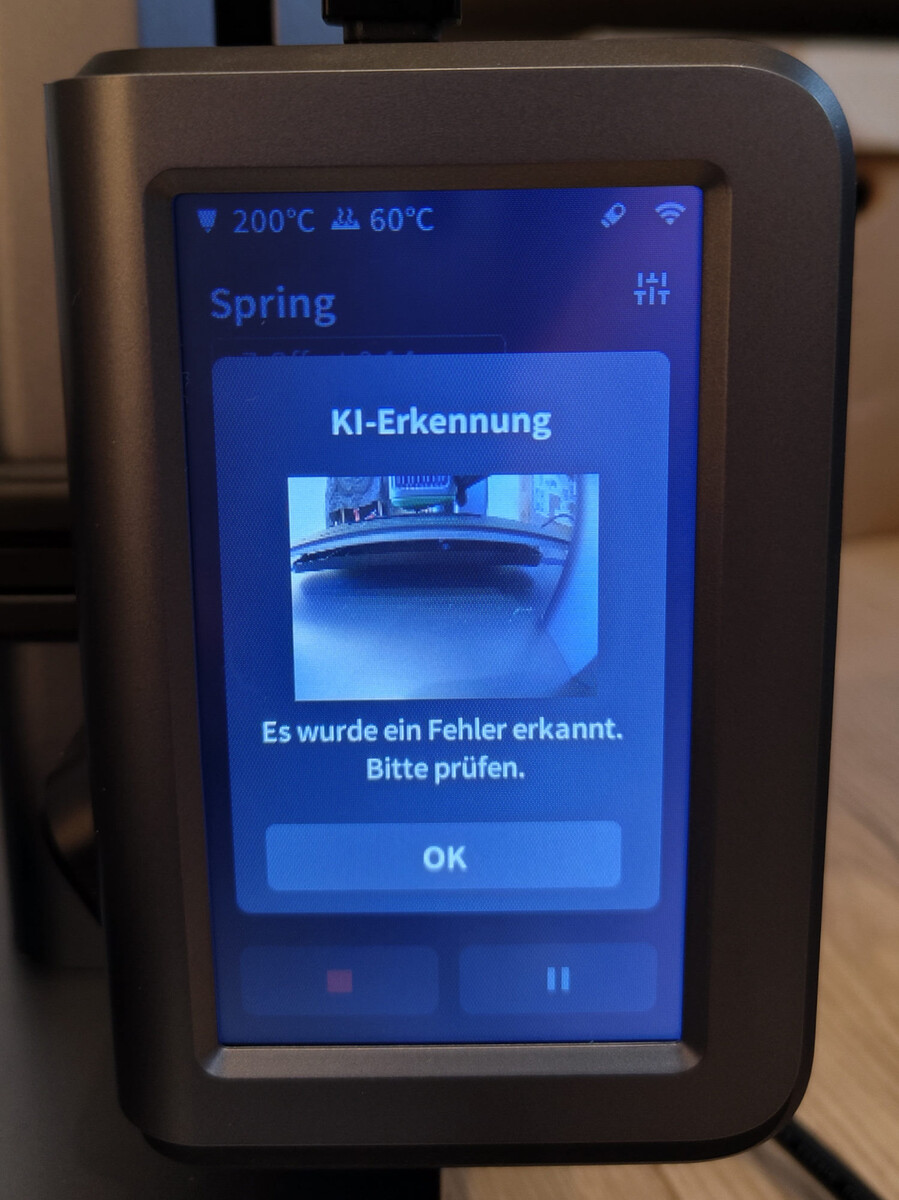 Wat betreft de AI-printassistent zijn we niet zeker van de resultaten van de 3D-printer. Met behulp van een infrarood camera controleert hij of de printer objecten produceert volgens de eisen - zelfs in verduisterde ruimtes. Bovenal heeft de AI van de AnkerMake M5 moeite met zwart filament. Op dit gebied was de AI zeer onbetrouwbaar. In het beste geval herkende de AI onmiddellijk een uitgelokte laagverschuiving en begon automatisch de 3D-printer te homen, waardoor de fout werd geëlimineerd. In het negatieve geval herkende de AI een beheersbare verschuiving pas na de tweede laag, zo'n 28 minuten later. Ook hier ging het printen door na automatisch homing en was daardoor onbruikbaar. Zelfs na 12 minuten kon de AI niet herkennen dat de print van het printbedoppervlak was losgekomen. Om schade aan het apparaat te voorkomen, werd het printen handmatig beëindigd. Bij het testen werd de slechte hechting van het printbed door ons geforceerd door de z-offset verkeerd in te stellen