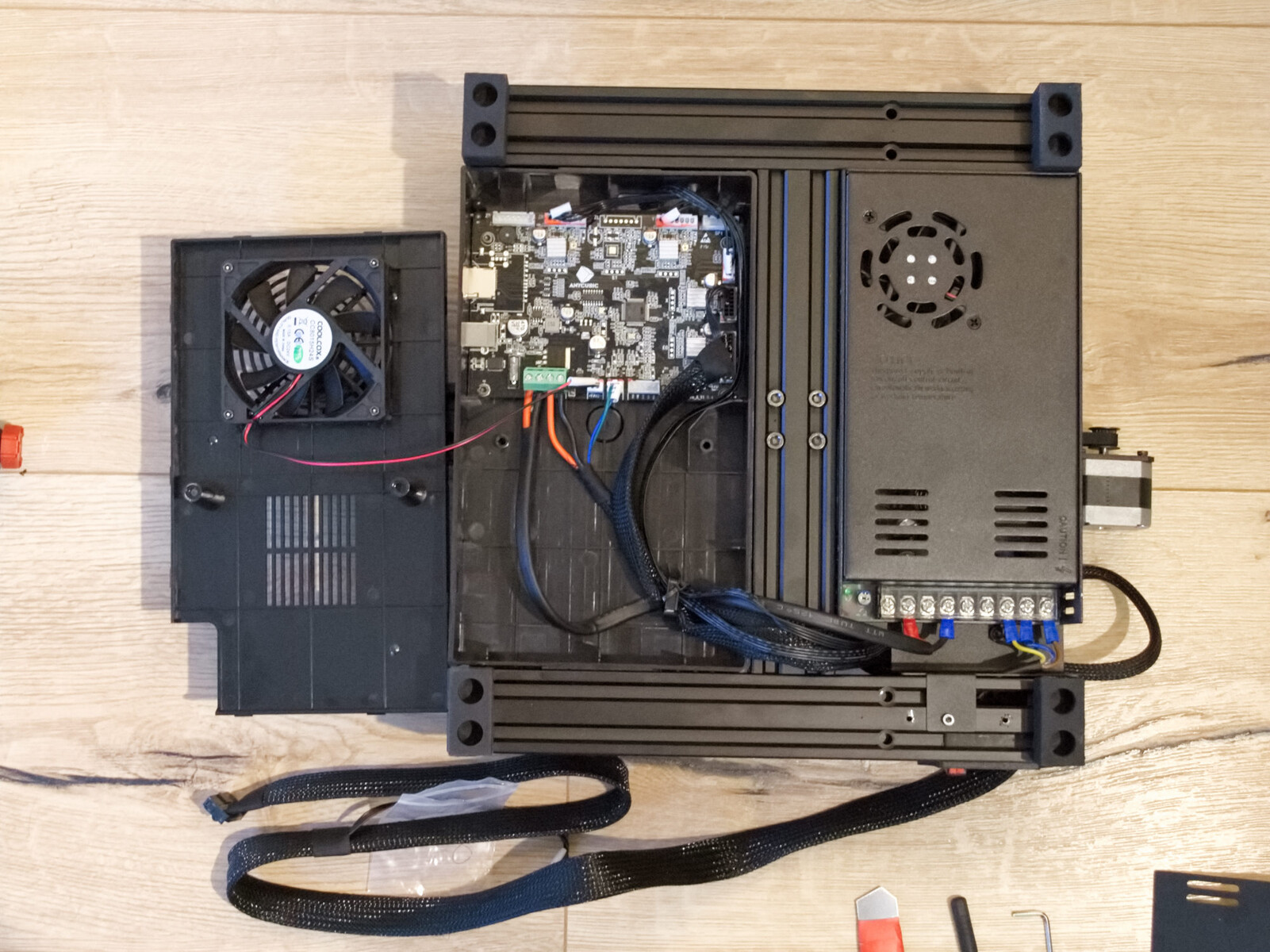 Op het eerste gezicht zien de kabels er netjes uit onder de deksels van het basisstation. De besturingsprintplaat is ondergebracht in een plastic behuizing. Bijna alle kabels zijn samengevoegd in een dikke kabelboom. Ter bescherming van deze kabelboom, die op de aluminium V-sleuven wordt gestoken, is een kabelklem bijgeleverd. Dit is waar we het eerste probleem tegenkomen