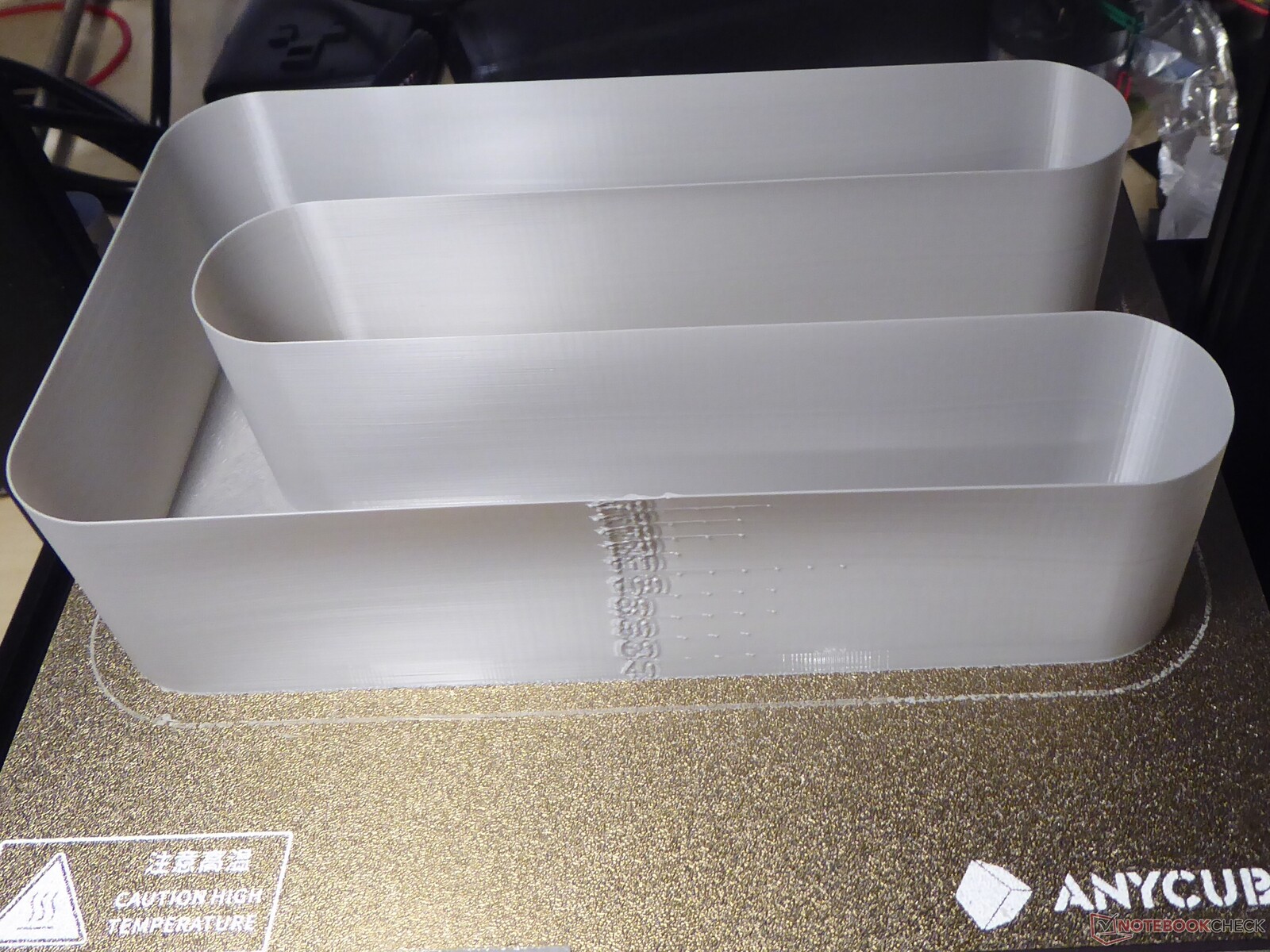 In de praktijk is geen van de testprints mislukt. De Anycubic Cobra reproduceert organische structuren zeer goed. Artefacten veroorzaakt door trillingen zijn slechts zwak zichtbaar, als ze al zichtbaar zijn. De golfpatronen veroorzaakt door de direct-drive extruder zijn echter iets zichtbaarder. Hoewel de invloeden van de tanden van het aandrijfwiel en het tandwiel in Bowden-extruders worden gedempt door de flexibele PTFE-buis, zijn ze hier duidelijk zichtbaar. Dit resulteert in een zeer duidelijk patroon op lange rechte lijnen.