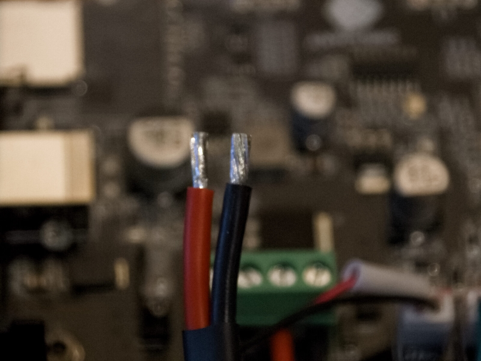 De kabelklem is moeilijk te bevestigen en knijpt de kabels extreem af. Een blik op de kabels die aan de schroefklemmen zijn bevestigd laat ook iets zien dat we niet graag zien. In plaats van een huls voor elektrische draden zijn hier vertinde strengen in de schroefklemmen aangebracht. Op den duur kan het zachte soldeer gaan vloeien, wat betekent dat er geen goede elektrische verbinding meer is. Daarom moeten de aansluitingen van de schroefklemmen regelmatig worden geïnspecteerd. gebogen kabelklem