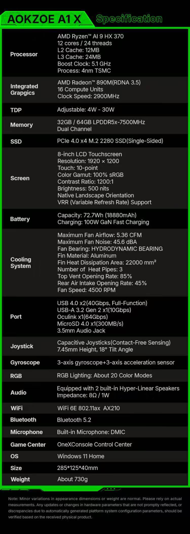 Bovendien is de Aokzoe A1X verkrijgbaar met maximaal 64 GB LPDDR5X RAM geklokt op 7.500 MT/s en een M.2 2280 SSD. Aokzoe meldt dat er capacitieve joysticks aan boord zijn, evenals een 3-assige gyroscoop. Bovendien heeft de A1X USB 4 en OCuLink connectiviteit tot zijn beschikking, plus een Micro SD 4.0 kaartsleuf met een snelheid tot 300 MB/s en een USB Type-A 3.2 Gen 1 poort met een snelheid van 10 Gbps.