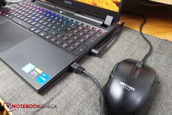 De aansluitmogelijkheden van de Aorus laptop zijn modern, maar ook minimaal. Van de drie USB-poorten is er slechts één Type-A, wat niet genoeg is. Een van de twee Type-C poorten heeft Thunderbolt 4 ondersteuning. Naast een vierde USB-aansluiting mist het apparaat ook een SD-kaartlezer, een Kensington-slot en een speciale DisplayPort (2x beschikbaar via USB-C).