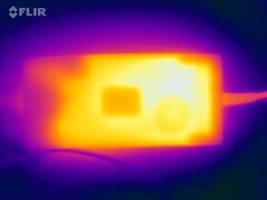 Hij wordt heet bij hoge belasting, vooral aan de onderkant in het midden van het apparaat in de richting van het beeldscherm. Bij maximaal 50 °C ligt de temperatuur echter binnen het bereik van typische gaming laptops. De bovenkant blijft zelfs verrassend koel met een maximum van 43 °C. In de turbomodus zijn de temperaturen zelfs nog lager.