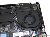 Nadat u alle schroeven aan de onderkant van het apparaat hebt verwijderd, kunt u een platte spatel of plectrum gebruiken om het onderste kastdeel te helpen verwijderen. Vervolgens hebt u toegang tot de geheugenbanken (beide bezet), beide SSD's (PCIe 4, M.2-2280), de WLAN-module, de ventilatoren, de BIOS-batterij en de gewone batterij.