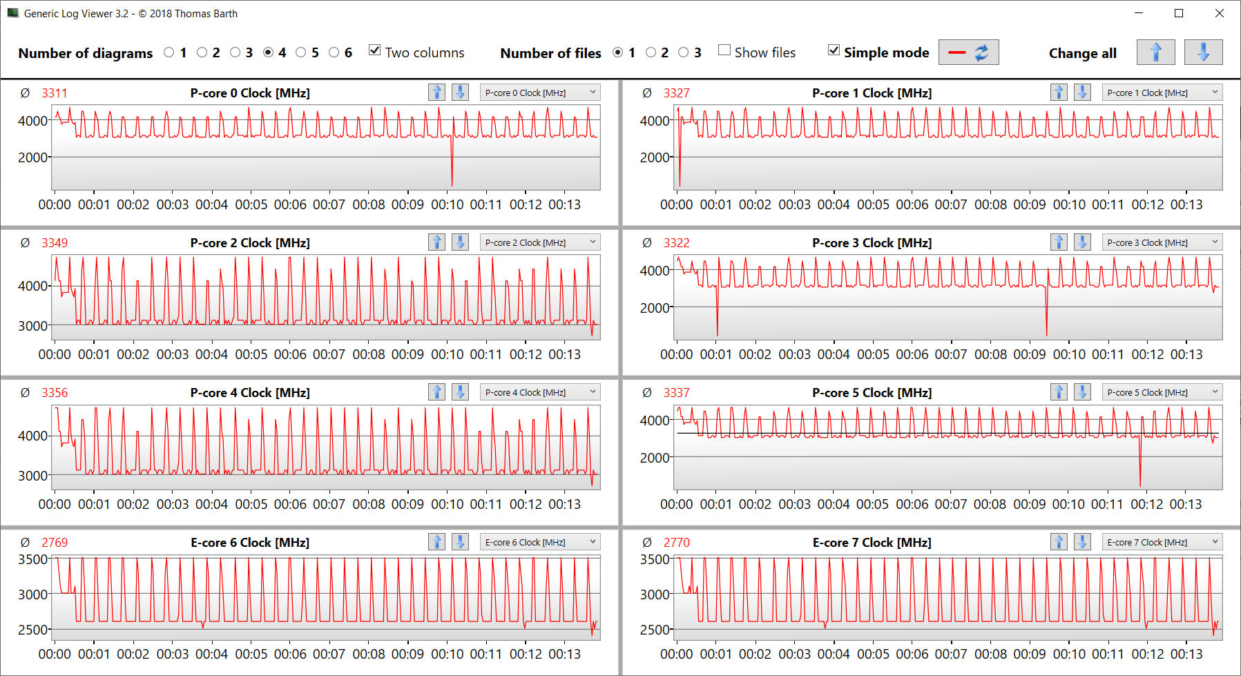 De CPU voltooide de stresstest op 2,5 GHz (P-cores) en 2,2 GHz (E-cores). De GPU draait op snelheden van meer dan 1000 MHz. De stresstest is een extreem scenario. We gebruiken deze test om na te gaan of het systeem stabiel draait onder volledige belasting.