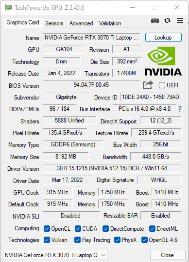 | Aorus 17 XE4 GeForce RTX 3070 Ti Laptop GPU, i7-12700H, Gigabyte AG470S1TB-SI B10 | Razer Blade 17 RTX 3080 Ti GeForce RTX 3080 Ti Laptop GPU, i7-12800H, Samsung PM9A1 MZVL21T0HCLR | Lenovo Legion 5 Pro 16 G7 i7 RTX 3070Ti GeForce RTX 3070 Ti Laptop GPU, i7-12700H, Samsung PM9A1 MZVL21T0HCLR | MSI Vector GP66 12UGS GeForce RTX 3070 Ti Laptop GPU, i9-12900H | |
