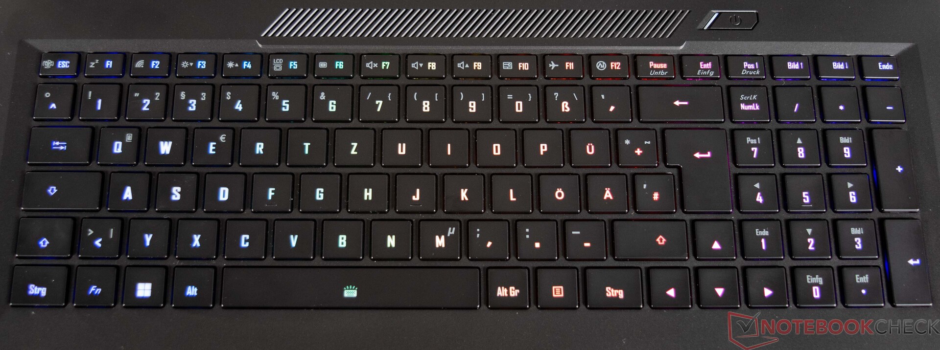 De Aorus 17X AZF wordt geleverd met een verlicht 6-rijig chiclet-toetsenbord, inclusief een numpad. De gladde toetsen hebben een gemiddelde veerweg en een duidelijk drukpunt. Het toetsenbord geeft iets mee tijdens het typen, maar dit is niet overdreven. De achtergrondverlichting kan worden aangepast op drie niveaus van helderheid met behulp van een toetscombinatie, en er zijn veel meer opties voor verlichtingseffecten via het GCC (Gigabyte Control Center).