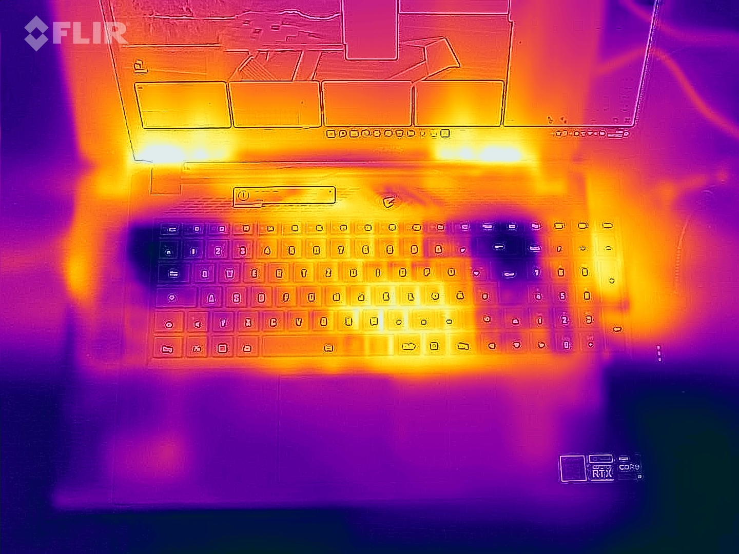Een groot deel van de warmte wordt afgevoerd via de onderkant, die enkele graden warmer wordt dan de bovenkant. We meten een maximumwaarde van 65 °C (149 °F). Dit betekent ook dat u de Aorus 17X niet op een gewatteerd oppervlak moet gebruiken, maar dat u hem het beste op een stevig oppervlak zoals een bureau kunt plaatsen.