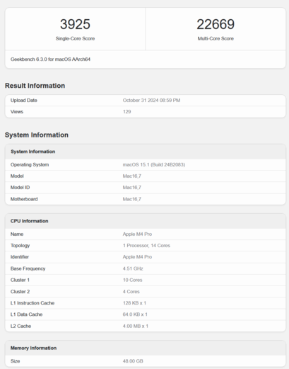 De onlangs onthulde Apple M4 Pro heeft zojuist zijn Geekbench-debuut gemaakt naast wat lijkt op een 16-inch MacBook Pro. Deze specifieke variant is het uitgeruste model met een 14-core CPU, 20-core GPU en 48 GB RAM. Hij levert een uitzonderlijke generatie-over-generatie verbetering ten opzichte van de M3 Pro in zowel CPU- als GPU-prestaties.