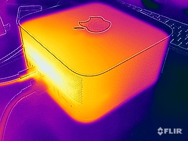 Onnodig te zeggen dat oppervlaktetemperaturen niet zo belangrijk zijn voor desktop computers en beeldschermen als voor laptops, maar we kunnen ook hier het alles-veilig geven omdat het toch niet echt heet wordt. De bovenzijde van de Mac Studio warmt op tot ongeveer 36 °C (~97 °F) in de stresstest, aangezien het koellichaam er direct onder zit. We registreren ongeveer 40 °C (~104 °F) direct bij de ventilatoruitlaat, wat betekent dat alles binnen veilige grenzen is. De Studio Display toont ook een hotspot aan de achterzijde, maar 30 °C (~86 °F) is absoluut prima