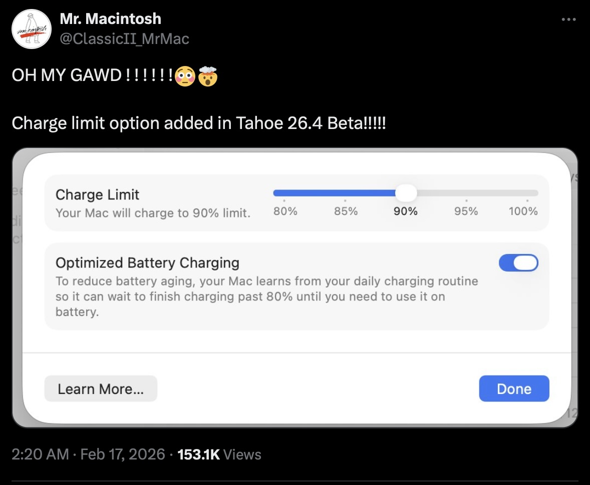 Met de nieuwste macOS Tahoe 26.4 Betalijkt Apple het graf te hebben gegraven voor apps als AlDente. Voor het eerst kunnen MacBook-gebruikers laadlimieten afdwingen binnen de app Systeeminstellingen, hoewel de laagst mogelijke waarde is vergrendeld op 80%. Gebruikers die om wat voor reden dan ook nog lagere waarden willen, zullen nog steeds moeten kiezen voor oplossingen van derden.